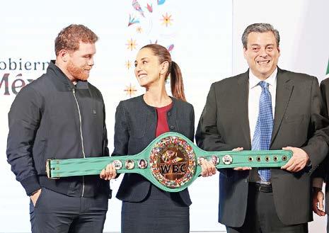 EN LA IMAGEN, LA PRESIDENTA DE MÉXICO, Claudia Sheinbaum, al anunciar ayer que buscará realizar la clase de boxeo más grande del mundo en compañía del campeón mexicano Saúl “Canelo” Álvarez y el presidente del Consejo Mundial de Boxeo, Mauricio Sulaimán, en abril de 2025. La mandataria federal cerró una semana de especulaciones sobre las amenazas arancelarias del presidente electo de Estados Unidos, Donald Trump, al mostrarse muy confiada en que su gobierno llegará a acuerdos en migración y narcotráfico para evitar dichos impuestos. LA