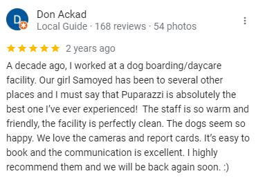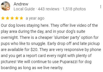 PuparazziOffersfull-day,half-dayandhourly stays!Yourpoochwilllovesocializingwith otherdogswhilebeingsupervisedbyour professionallytrainedcaregivers.Receive photoupdatesthroughoutthedayfromour petcareattendants.Youcanalsowatchyour dogplaythroughourwebsiteonourpuppy peekcams.