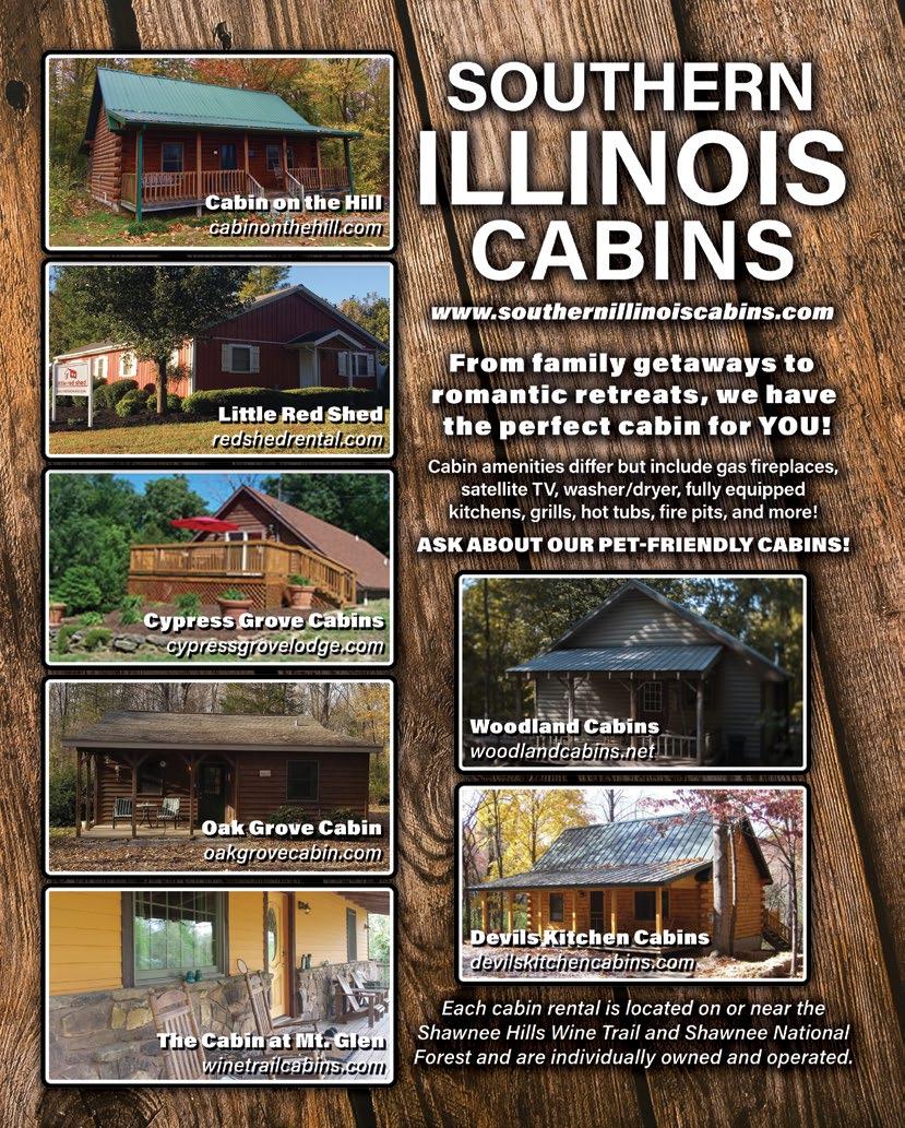 lake with cabins situated around it. Oak Grove and Devil's Kitchen Cabins are both in private, wooded areas. Cypress Grove Lodge is a larger unit that accommodates up to eight people. Cabin at Mt. Glenn is set on woods and pasture lands. Cabin on the Hill and Oak Grove both have a cabin that is pet friendly. You can find a link to each of the cabin’s websites at southernillinoiscabins.com.