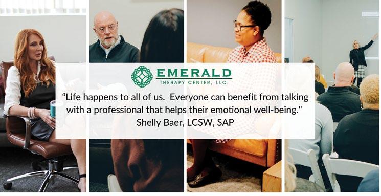 Our cover features Emerald Therapy Center’s founder and co-owner, Shelly Baer, LCSW, SAP, with her two grandsons, Rivers and Memphis. Known as Gigi to her grandchildren, this strong businesswoman loves her community and is dedicated to bringing the best emotional healthcare to our area. Welcome to Emerald Therapy Center, where your best days are ahead.