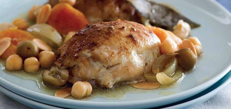 In a large bowl, toss the chicken thighs with the onion, cumin, ginger, coriander, cinnamon, and cayenne, and season with salt and pepper. Heat Olive oil in a Dutch oven or heavy pan with a lid. When the oil is hot, transfer the chicken and onions to the pan and cook over high heat for about 10 to 15 minutes. Add the bay leaf and chicken broth, chickpeas, olives, and apricots, cover, and reduce to a simmer. Cook until the chicken is tender and cooked through and the apricots are plump about 1 hour. Remove the bay leaf and season the juices with salt and pepper.