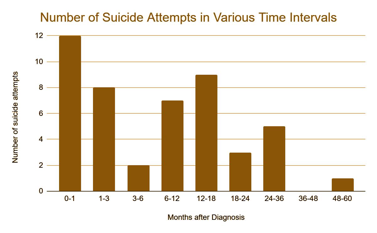 autoimmune disorders (4) The Korean National Health Insurance Database recorded mental health prevalence in individuals diagnosed with ALS (5). The graph displays that during early onset of diagnosis is suicidal tendencies most prevalent The trends have been observable worldwide marking it a global issue