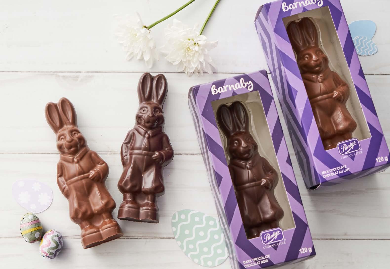 Our most dapper bunny, Barnaby, is made with delicious solid chocolate. Presented in a fresh and festive gift box. 24275 Milk 120 g $11 24276 Dark 120 g $11 Topsy Bunny Delightful in any Easter basket, Topsy is made of creamy solid chocolate. 24214 Milk | 110 g | $6