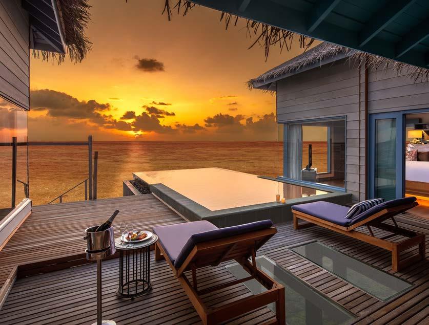 The Sunset Overwater Residence offers the perfect balance of social spaces and private areas. Two separate bedrooms, and outdoor terrace and infinity pool are perfect for time together as well as privacy.