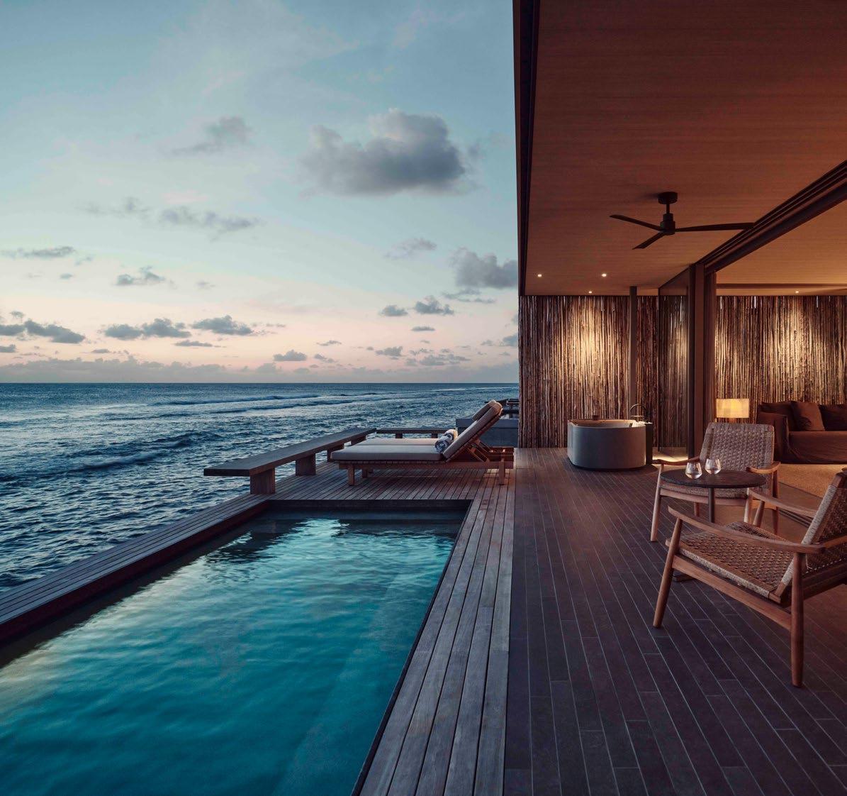 Exclusivity is the word on the water for these one-bedroom villas, with an infinity pool, expansive deck and views to the horizon. Floor-to-ceiling glass doors open to create a seamless connection with the outdoors. Interiors are created from natural materials in harmony with the environment.