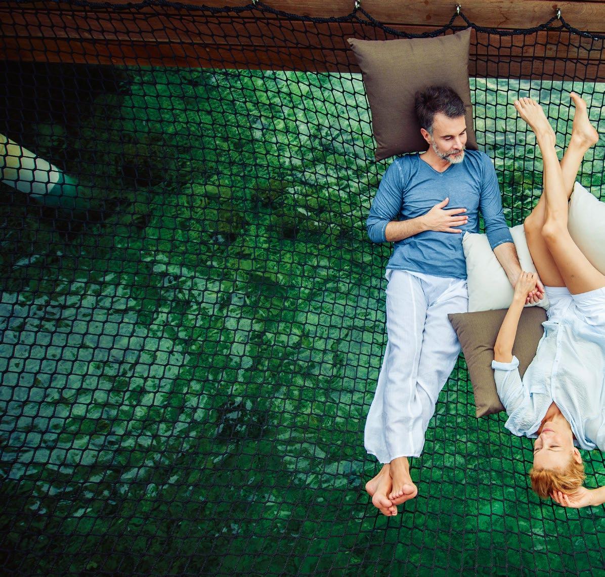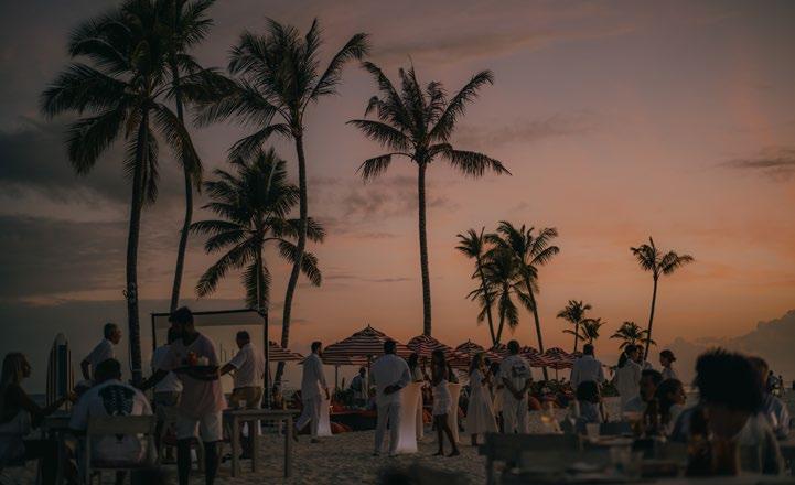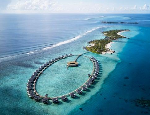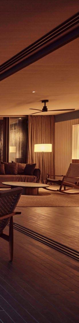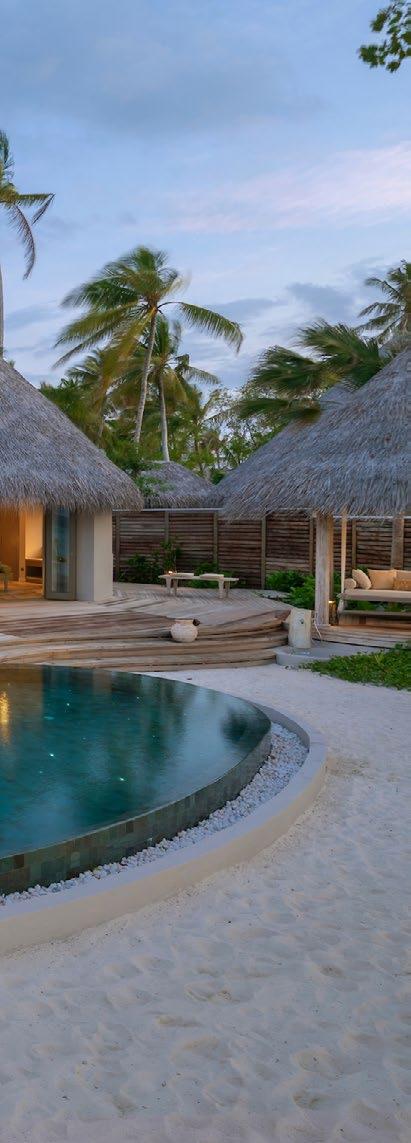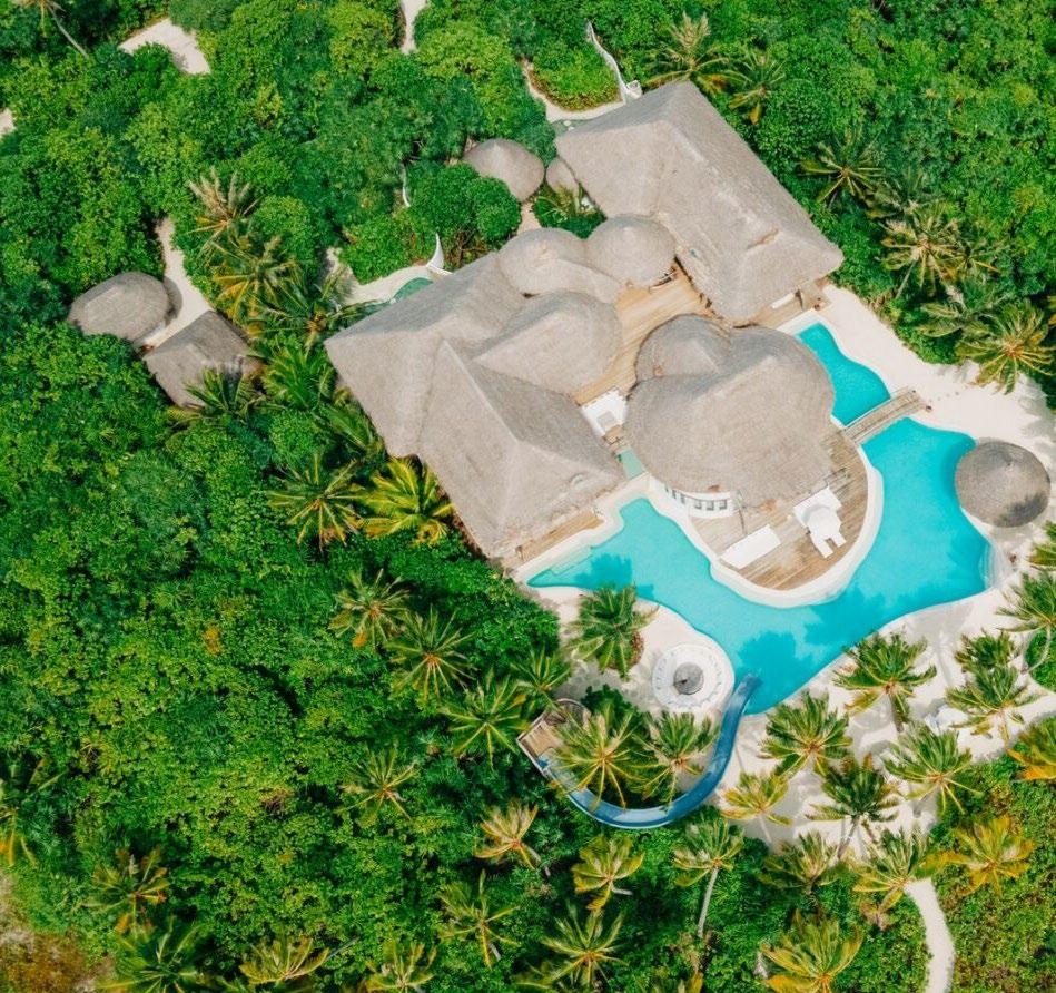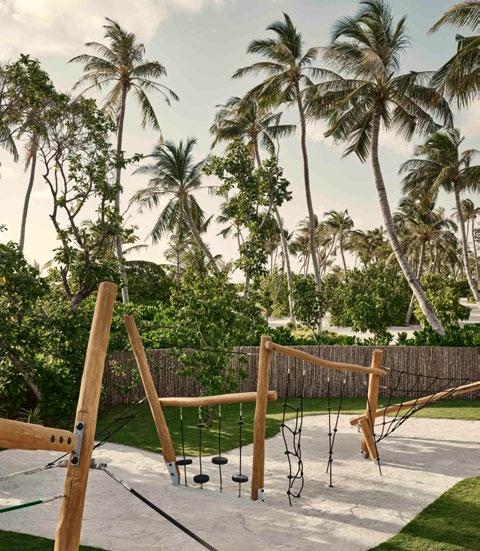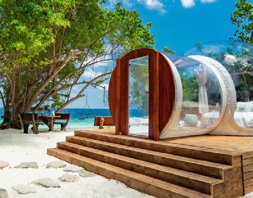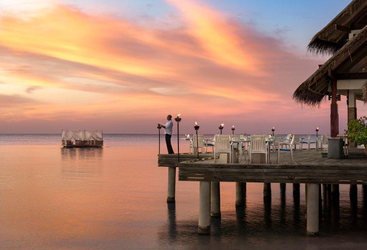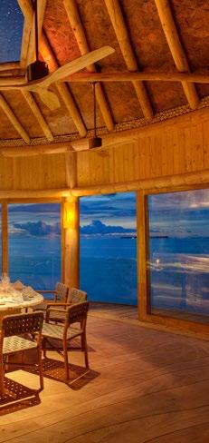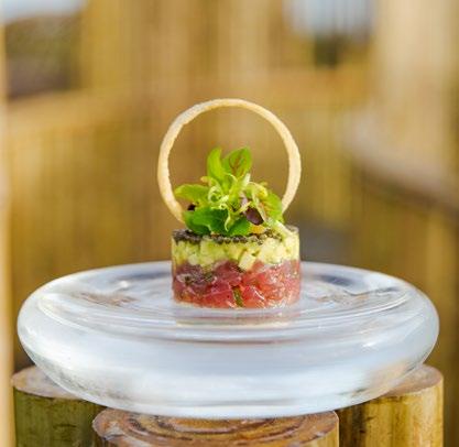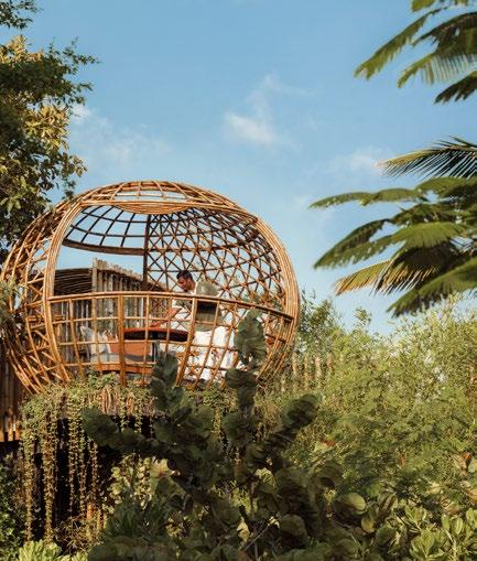 Seven hand-crafted bamboo pods invite guests to sit for a sevencourse dinner at Waldorf Astoria Ithaafushi’s Terra restaurant. Set amidst the treetops, the venue and menu give guests a fresh perspective on dining. Each course is artfully presented on nature-