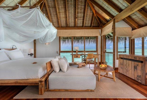 Couple’s may soak in the summer sun from their overwater hammocks, daybeds or private infinity pool. Light and lavish in design, this intimate escape offers indoor and outdoor living areas for both entertainment and relaxation. Floor to ceiling windows ensure constant views of the ocean beyond.