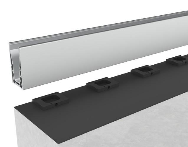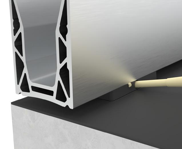above the substrate on drain blocks. Notches on the top side of the drain blocks locate into the rebates of the POSIglaze, POSIone or POSI-Lite base channel, locking it into position before the system is bolt-fixed to the substrate through each block. The gaps between the drain blocks are your water drainage channels. The drain blocks are subsequently filled with sealant to create a fully waterproofed balustrade installation. The system works best when a single or duel ply waterproof membrane such as EPDM or TPO is applied to the surface.