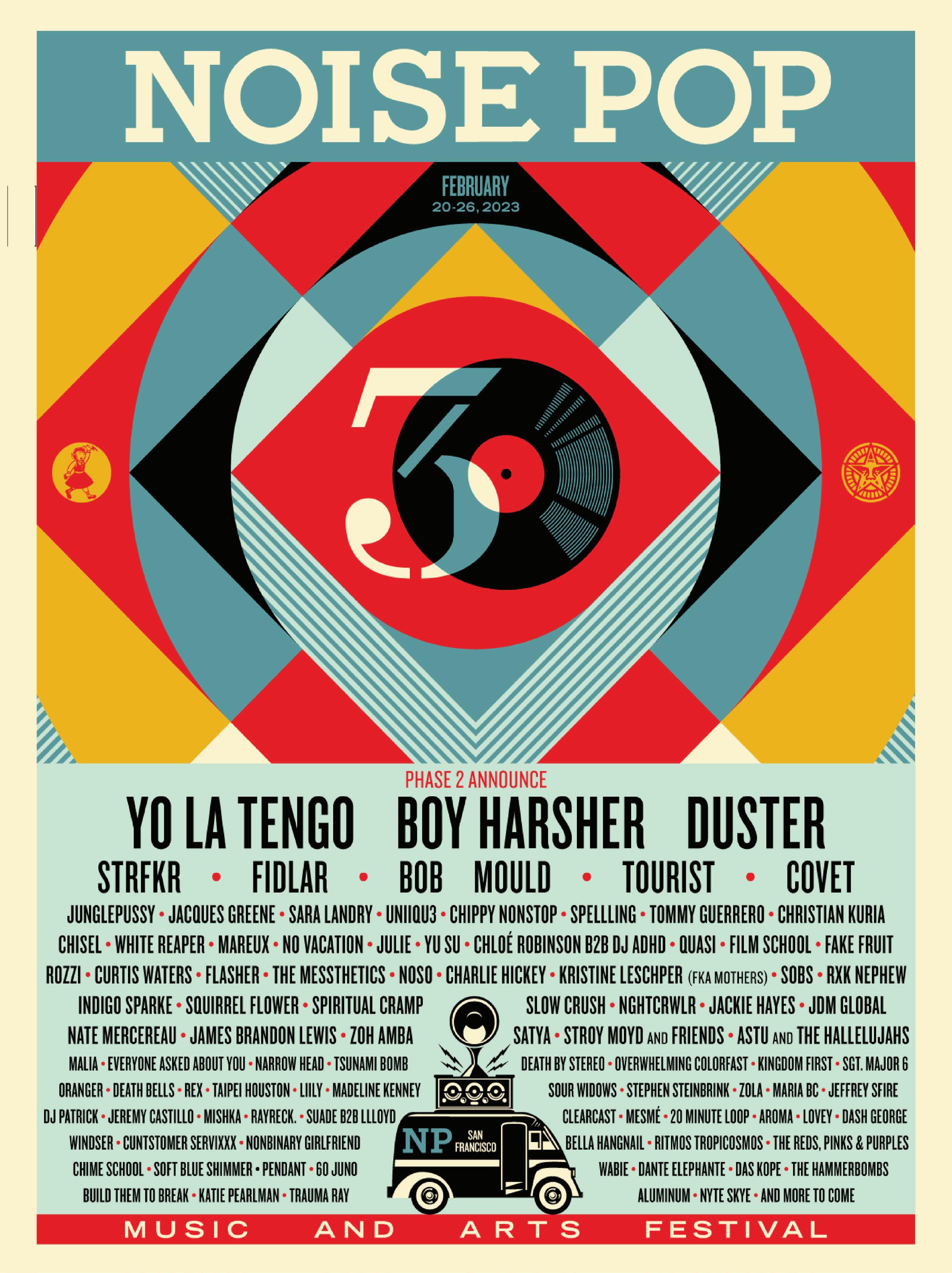 Recurring festival events including a multi-night series at the SFJAZZ Center and an international music showcase, He.She.They, are back in 2023. A newcomer to the festival, but not the area, is “The #HellaFunny Comedy Night, a mainstay of the Bay Area’s entertainment scene, with Noise Pop Festival stand-ups in store by Stroy Moyd, Chris Riggins, Allison Hooker, Emily Van Dyke and some promised surprise guests. There film screenings, multimedia demos, and organized happy hours, under the banner of a 30th anniversary poster designed by Shepard Fairey.