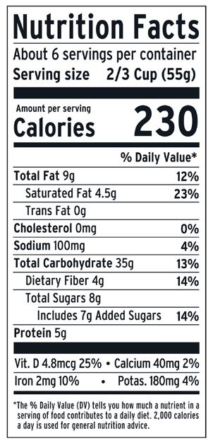 Intentionally crafted with whole food ingredients, our superfood cereal recipe provides an excellent source of Vitamin D and good source of fiber per serving.