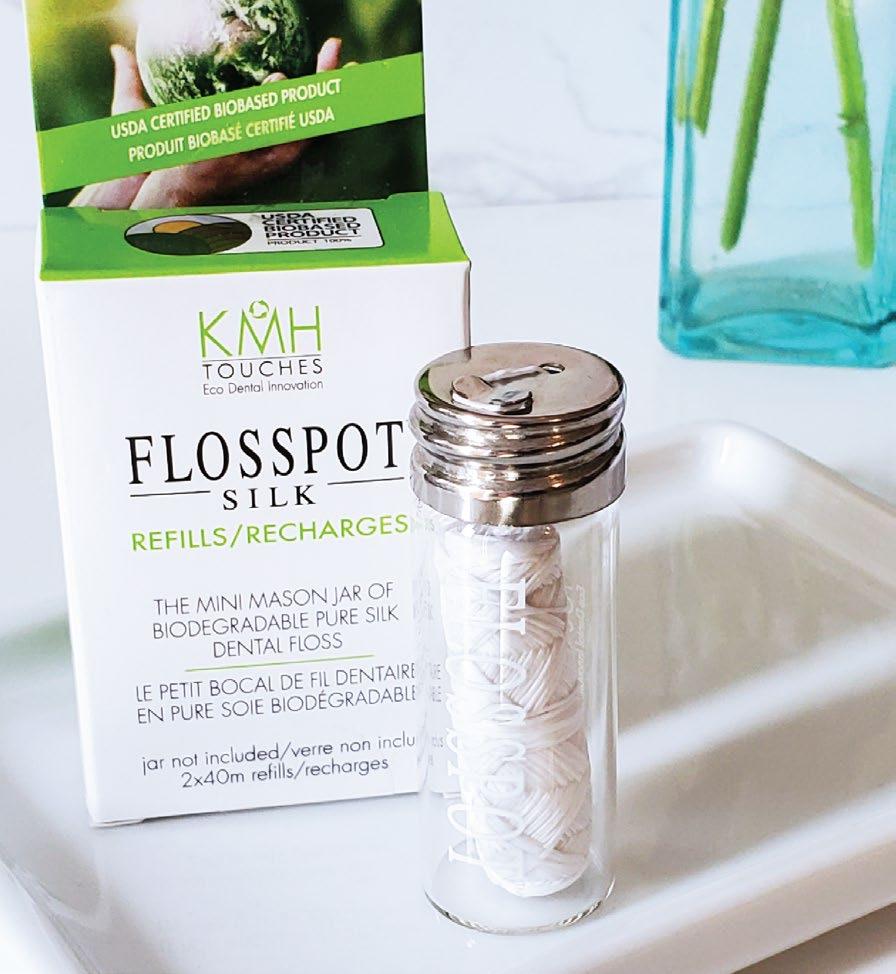 original, Flosspot™ Silk, est présenté dans un mini pot Mason m de soie dentaire luxueuse, légèrement cirée pour plus de résistance et de facilité d’utilisation entre les dents serrées — testée en laboratoire pour sa pureté. Flosspot™ Gold est un pot rechargeable en acier m de fil fabriqué en PLA à base de maïs, une alternative aux plastiques issus du pétrole — testé en laboratoire pour sa pureté et sa compostabilité.