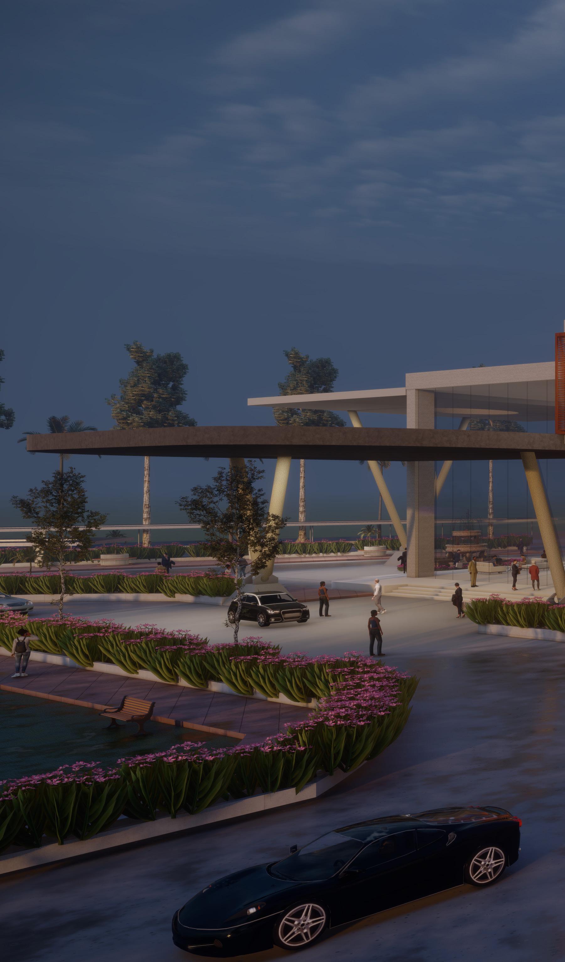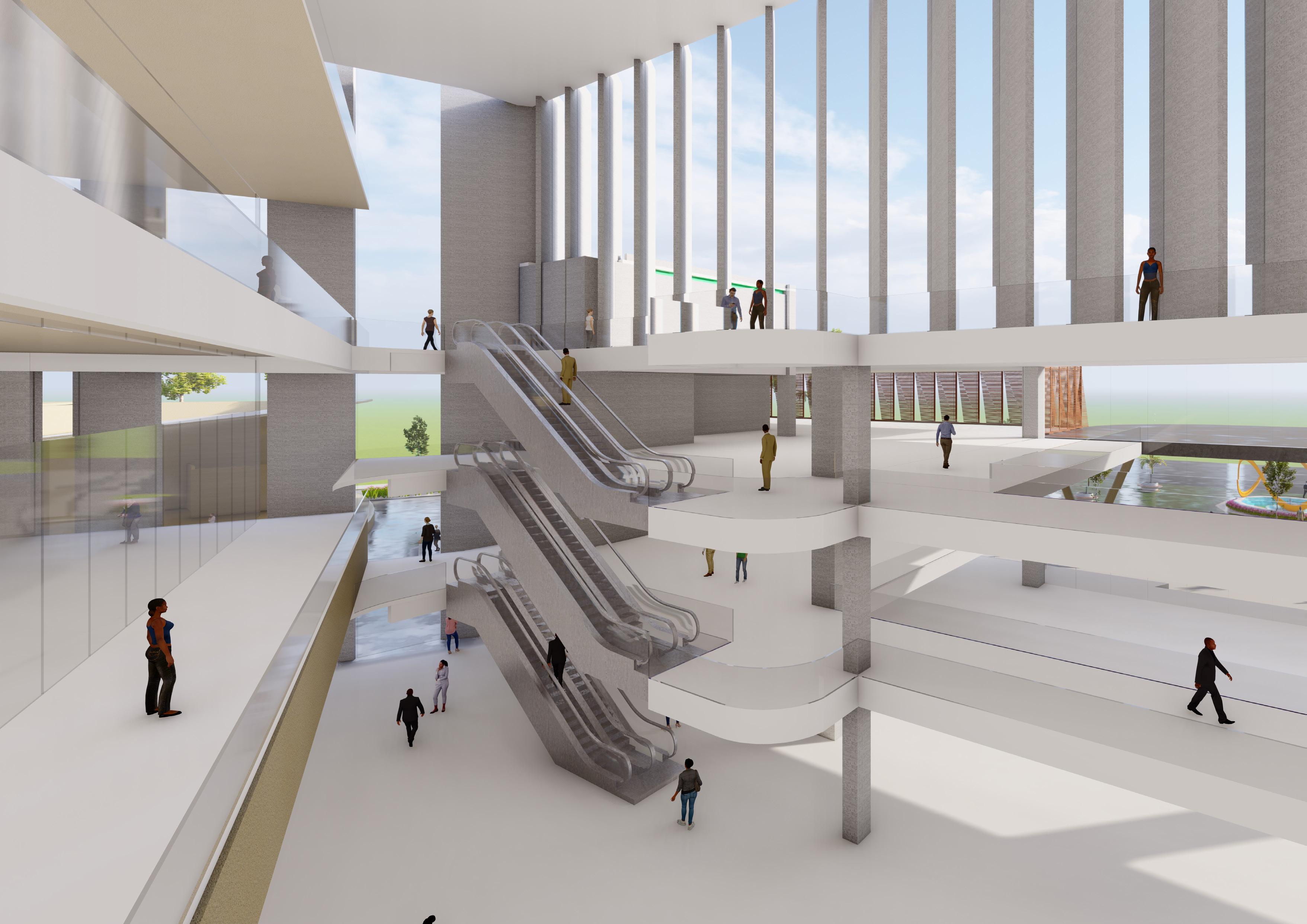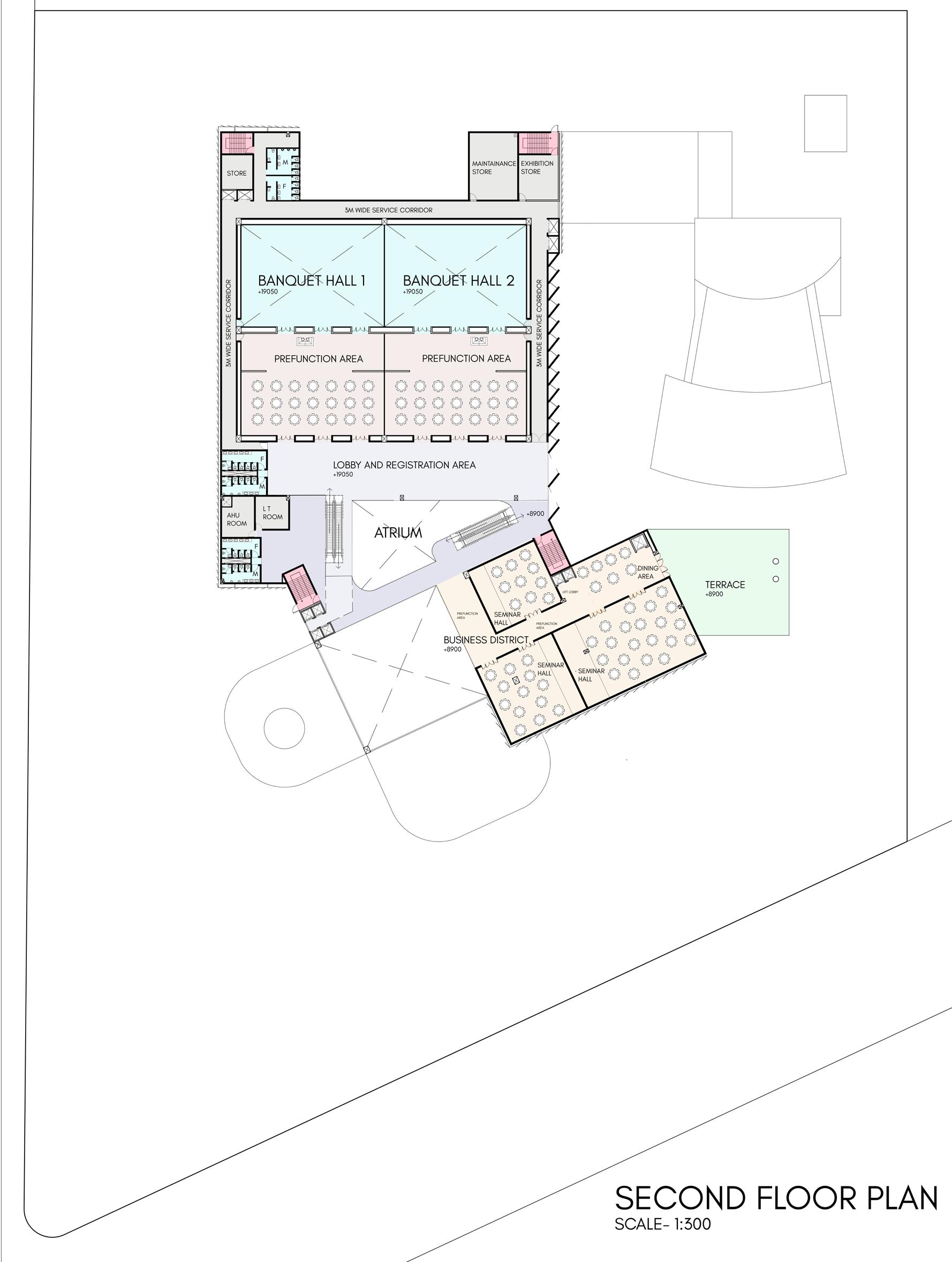 The proposed convention center in Mysore includes exhibition halls, banquet halls, residential suites, banks, and commercial shops. The center is envisioned as a cultural hub for the city. The design explores various aspects of massing and form to create an engaging and functional space.