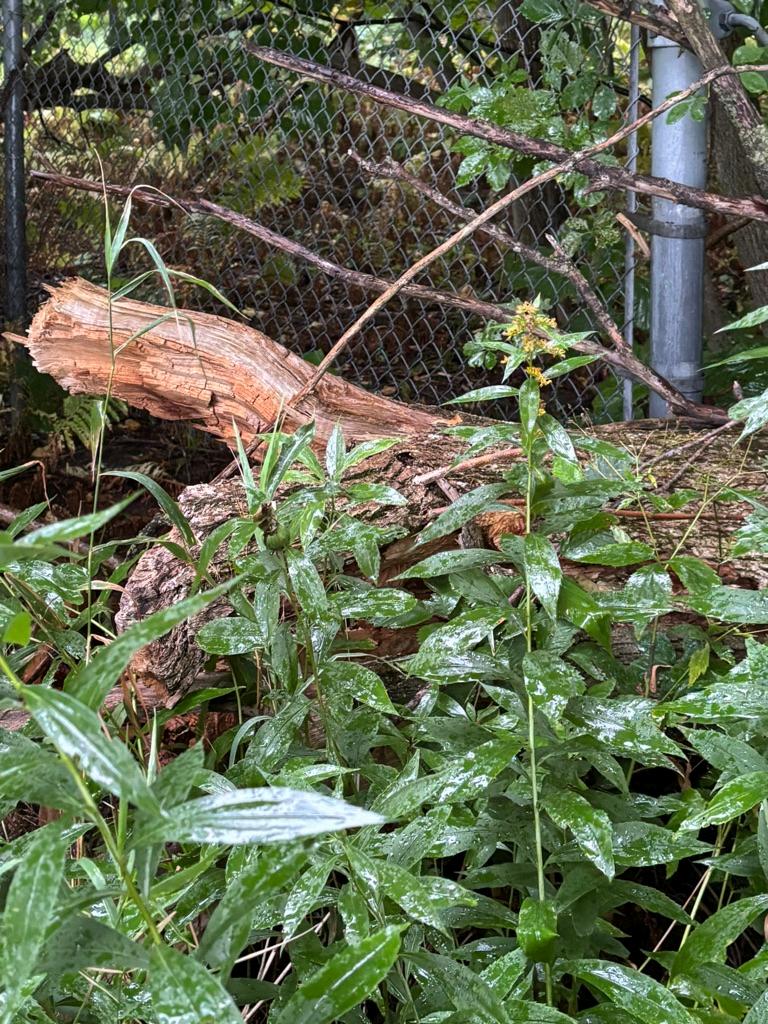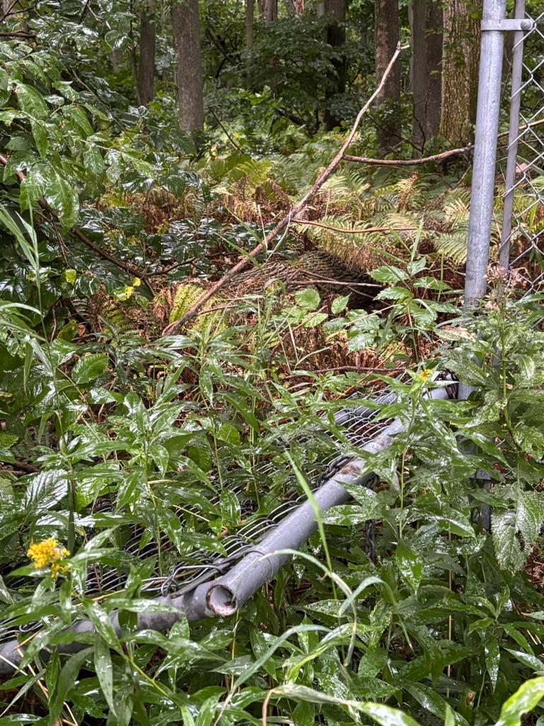 Nous avons constaté qu’un gros arbre était tombé sur la clôture, par le fait même à abimé et bouché l’entrée, donc nous avons dû contourner et entrer par le coté de la réserve pour effectuer le travail.