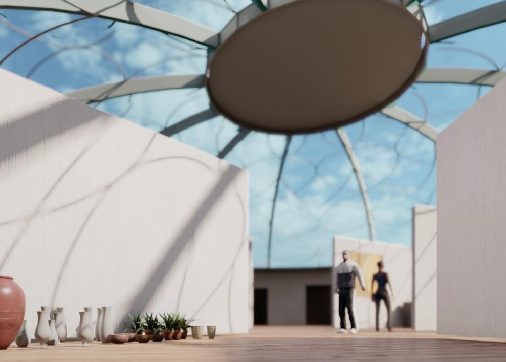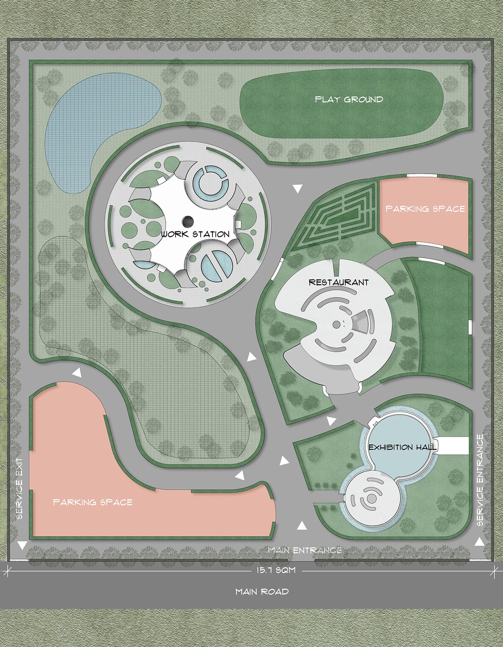 This Project have the total site area of 8640 SqM in which the built-up area is the 40%. Achieving maximum height of 7m. The site haveWarm and humid climate. The topography is flat. The pods are designed for the capacity of 25 people. This was designed taking consideration of the specially abled people, One of the pod is for the Pottery, second for the Sculpture and third for the paintings. This project have the consideration of the universal design principles in all the three spaces i.e working pod, Restaurant and Exhibition hall.