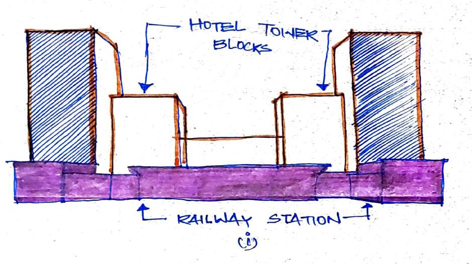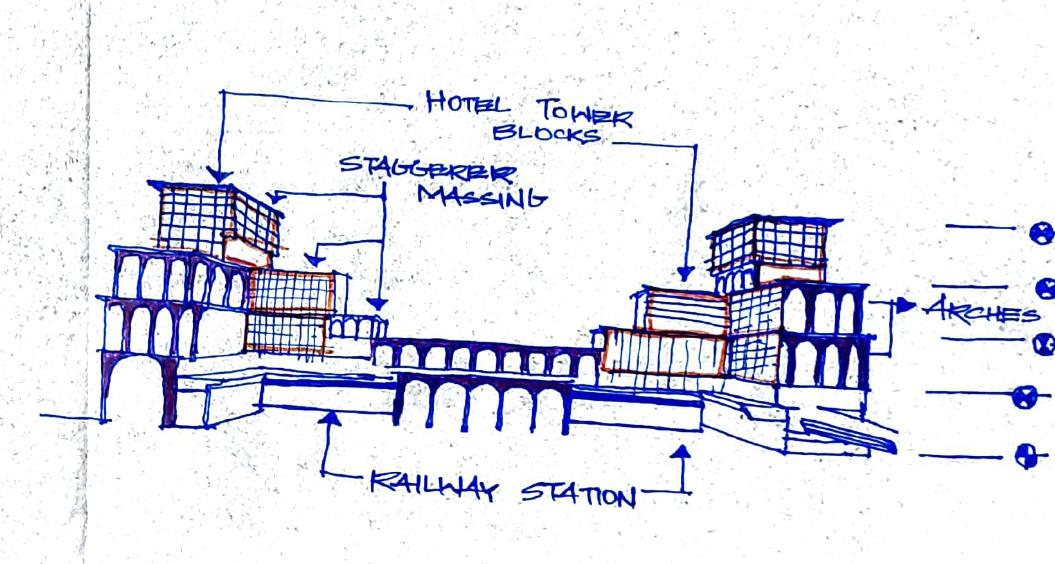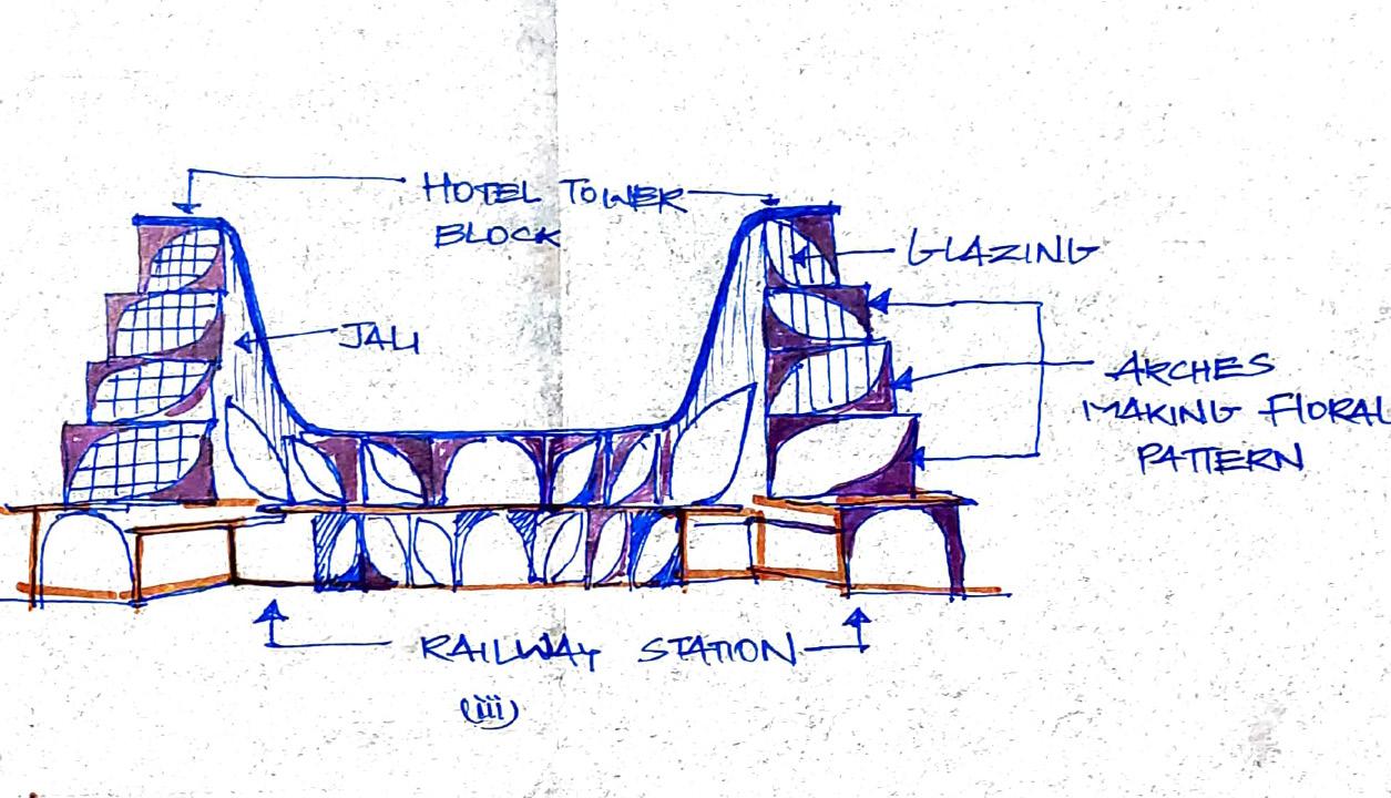 The Agra Cantt Railway Station Hotel Tower project involved the architectural design of hotel towers, integrating traditional elements reflecting the cultural identity of Agra. This design option drew inspiration from Udaipur’s architectural language, particularly its iconic arches, which influenced both the staggered massing of the building and the façade treatment. The design harmoniously blends traditional aesthetics with modern functionality, showcasing Agra’s heritage through its architectural features.