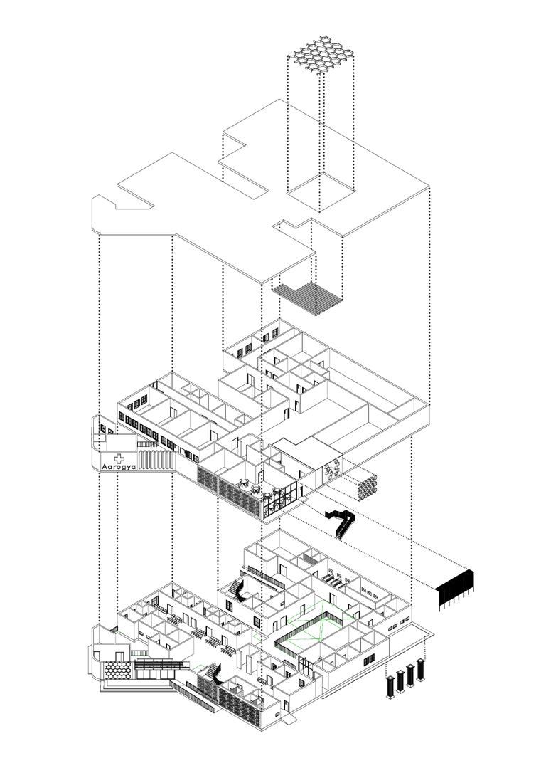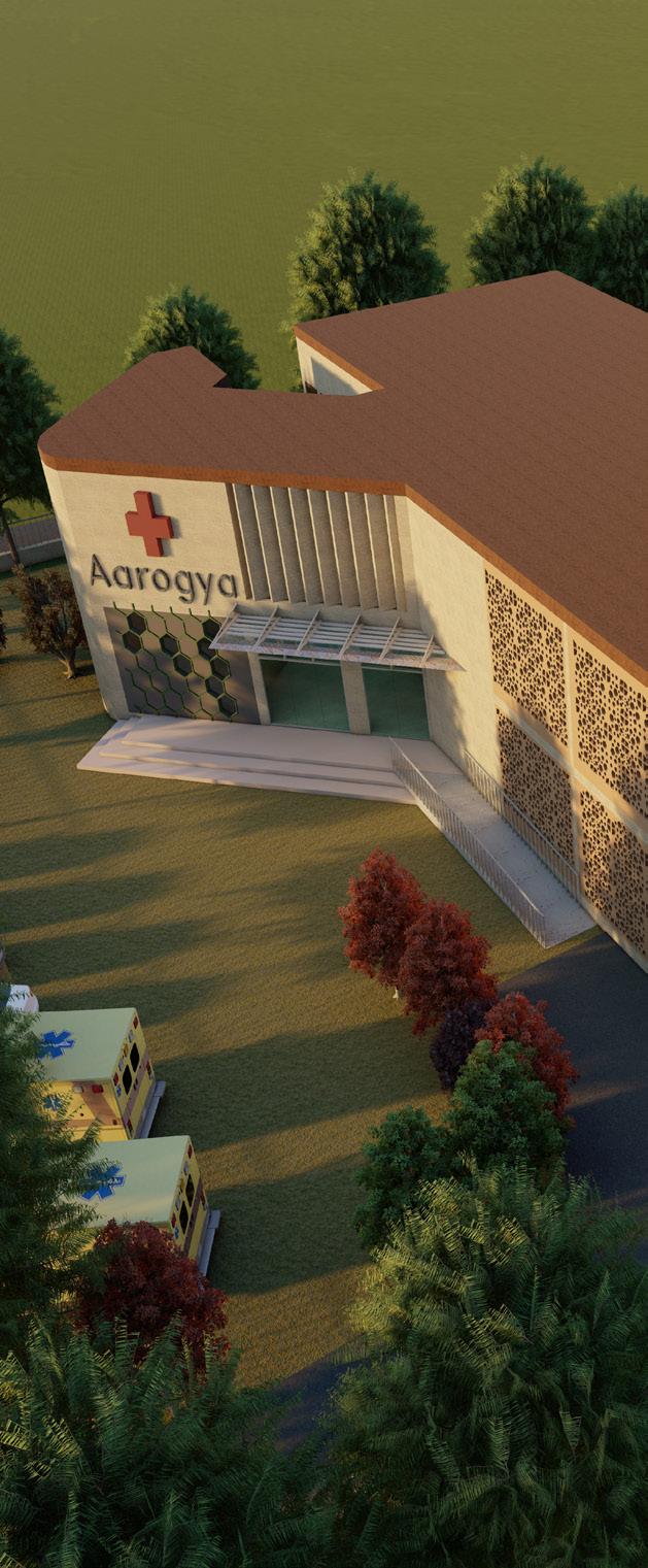 The Aarogya Community Healthcare Centre is a 30-bed medical facility strategically designed to enhance patient care and public accessibility in Patna, Bihar. The architectural approach prioritizes passive design strategies, ensuring optimal ventilation, seamless circulation, and a therapeutic environment. Integrated shading devices mitigate heat gain, fostering thermal comfort within the built space. Acoustic planning has been employed to buffer external noise, creating a serene healing atmosphere. The program includes OPD, IPD, and Emergency services, with the overall design adhering to universal accessibility standards, promoting inclusivity and efficiency in healthcare delivery.