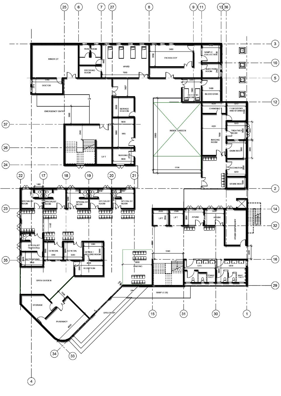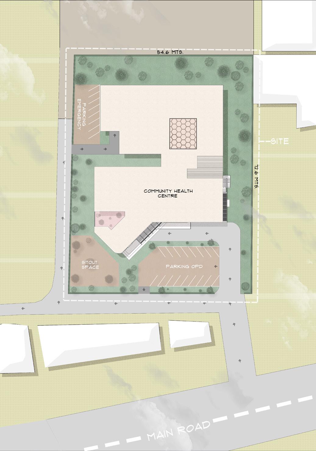 The Aarogya Project have the total site area of 4000 SqM in which the built-up area is the 50%. The site is divided into four major parts. At the front there is the OPD Parking area, on the left there is an sit-out space for the patient and there guardians,, in the left adjacent side there is parking provided for the Emergency ward. There is this two sub-Roads joininng the Aarogya CHC, ;the road on the front is for the OPD access and the road in the Left connects to the Emergency zone. The Design is developed according to the Circulation and security and safety of the users. As the weather of this location is Warm and Humid, so i have given some shading devices design and materials (Terracotta Jali).