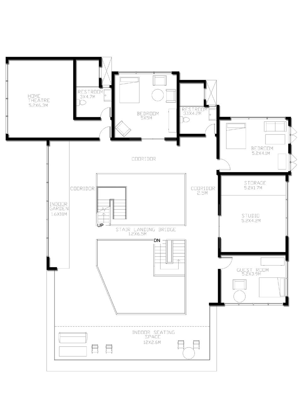The Khajok project occupies a total site area of 2040 square meters, with a built-up area constituting 46% of the site. The design adheres to a Floor Area Ratio (FAR) of 0.4. Key spatial allocations are as follows : At the Ground floor there is dedicated parking area for vehicles. Functional spaces include the entrance foyer, drawing room, common toilet, and guest bedroom. Additional facilities include an office space, living room, gaming room, master bedroom, indoor garden, sit-out space, and another living room. A staircase originating from the indoor garden connects to the upper levels. At the First floor it features a home theatre, guest bedroom, multiple bedrooms, an indoor garden, an indoor seating area, and an architecture studio. The design culminates in a terrace space, providing additional utility or recreational potential. The architectural program ensures efficient spatial planning while integrating functional and leisure spaces across all levels.