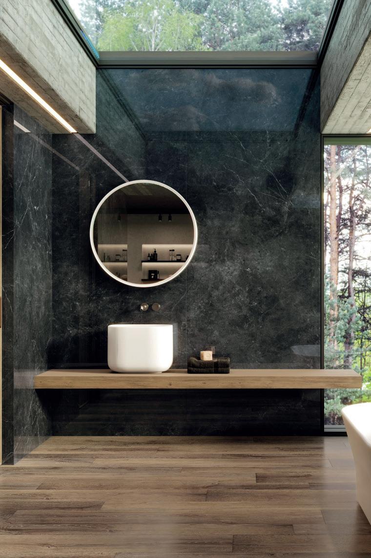 Porcelanosa's XLIGHT large-format porcelain tiles redefine luxury with their unparalleled elegance and versatility. Measuring 120 x 270 cm for cladding and 120 x 120 cm for flooring, the new Nero Velluto collection boasts a velvety texture and delicate veining that evokes the surface of dark marble. Porcelanosa's innovative COMET decorating technology is used in its production process to create a special luminous effect. Bright particles are applied to the grits and vary in intensity depending on the angle from which the surface is observed.