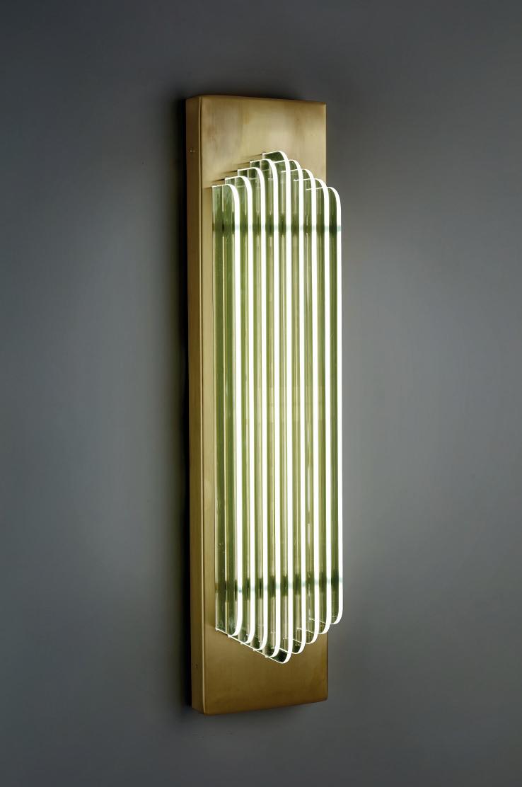 Designed by LA based Italian architect and designer, Davide Casaroli, the Esagono Wall Light is a contemporary monumental design composed of a folded brass wall plate onto which are mounted nine plate glass ‘fins’. These are backlit by LEDs mounted immediately behind the glass to produce a brilliantly illuminated sconce that can be installed horizontally or vertically. This fitting could be used equally effectively in a hotel lobby or corridor as in a bathroom and is a unique piece that can also be used as a ceiling fixture.