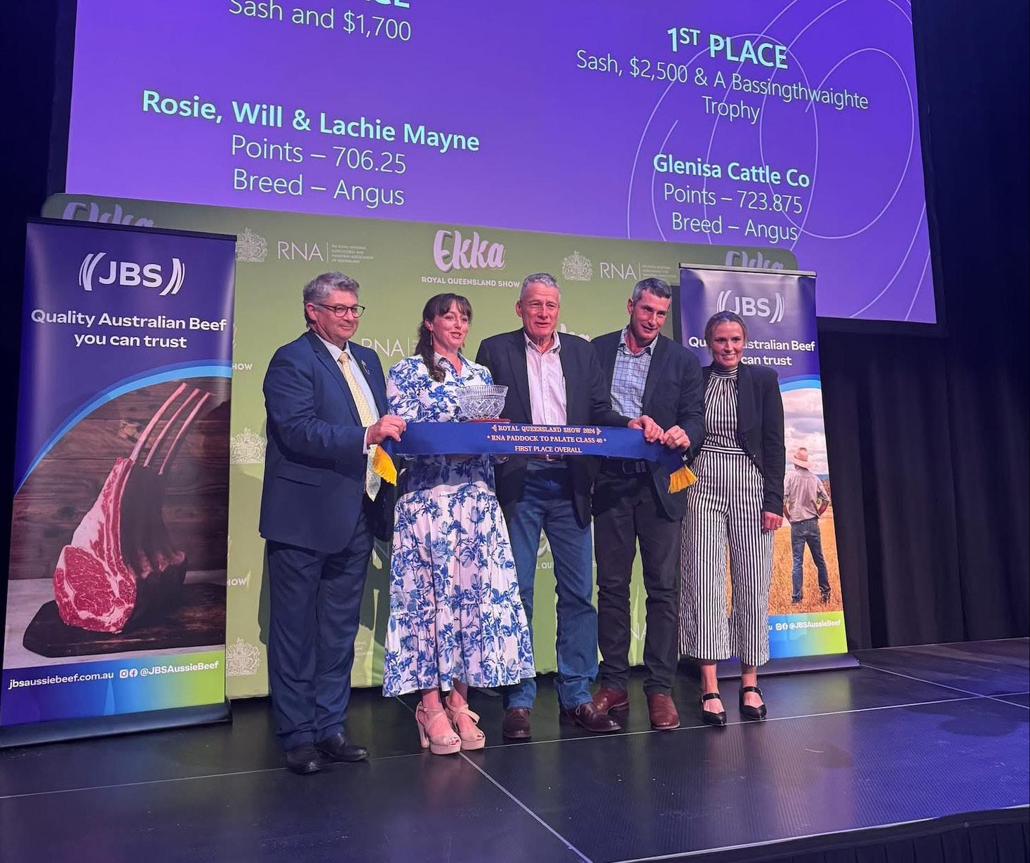 Left: Striving for excellence and kicking goals, Sam Lobegeiger and Ced Wise receive award on behalf of Glenisa Cattle Co., first place in Class 40 of the RNA Paddock to Plate competition awarded at the 2024 Ekka in Brisbane.
