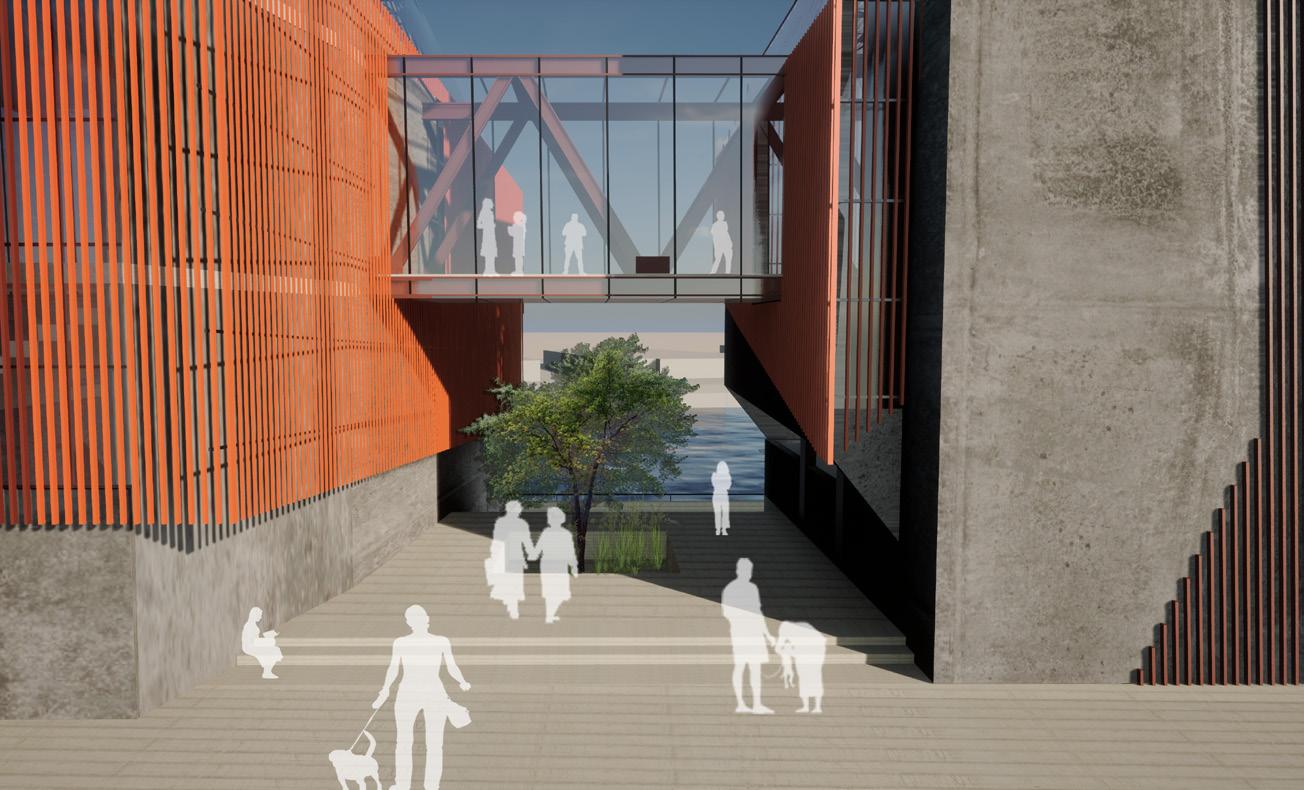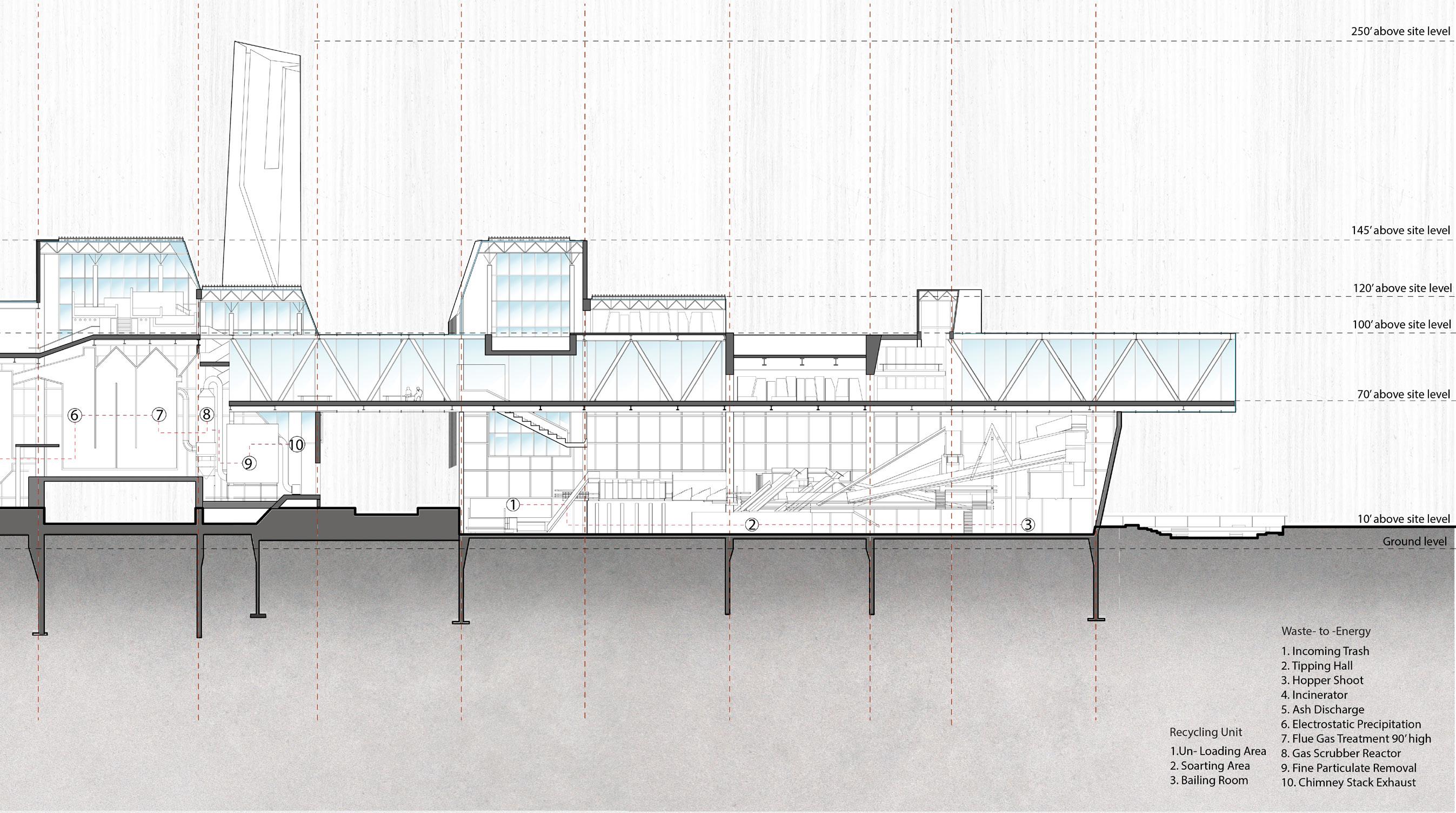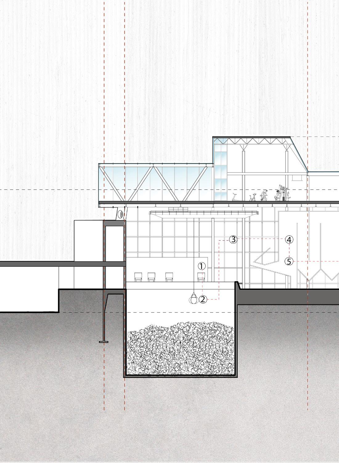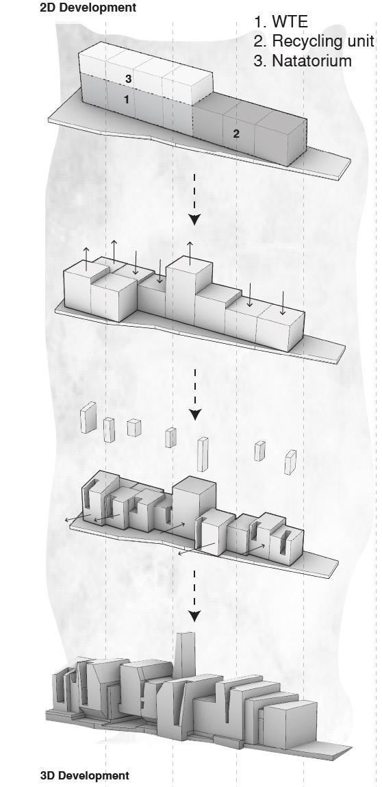 Our main goal is to draw in the local community members to learn about the effects of trash disposal. To build a connection between the waste and the other programs. Hence, a studio project with a brief to design waste to energy recycling plant with natatorium speculates the opportunities to blur the boundaries between various stages of industrial process of the factory. The formal language of the project involves the Natatorium’s activities spread across, with the goal of providing visitors with an insight into the ongoing industrial processes of WTE and recycling units that are occurring concurrently. The depressions are highly inspired by the contextual residential blocks while the scale of the massing is industrial, keeping in mind the functionality of the machinery. Interior follows the similar architectural language to carve the spaces that allows the users to experience different scale and volumes. The horizontal connectivity of glass bridges throughout the building that forms the critical point of visual connection of programs and the outside.