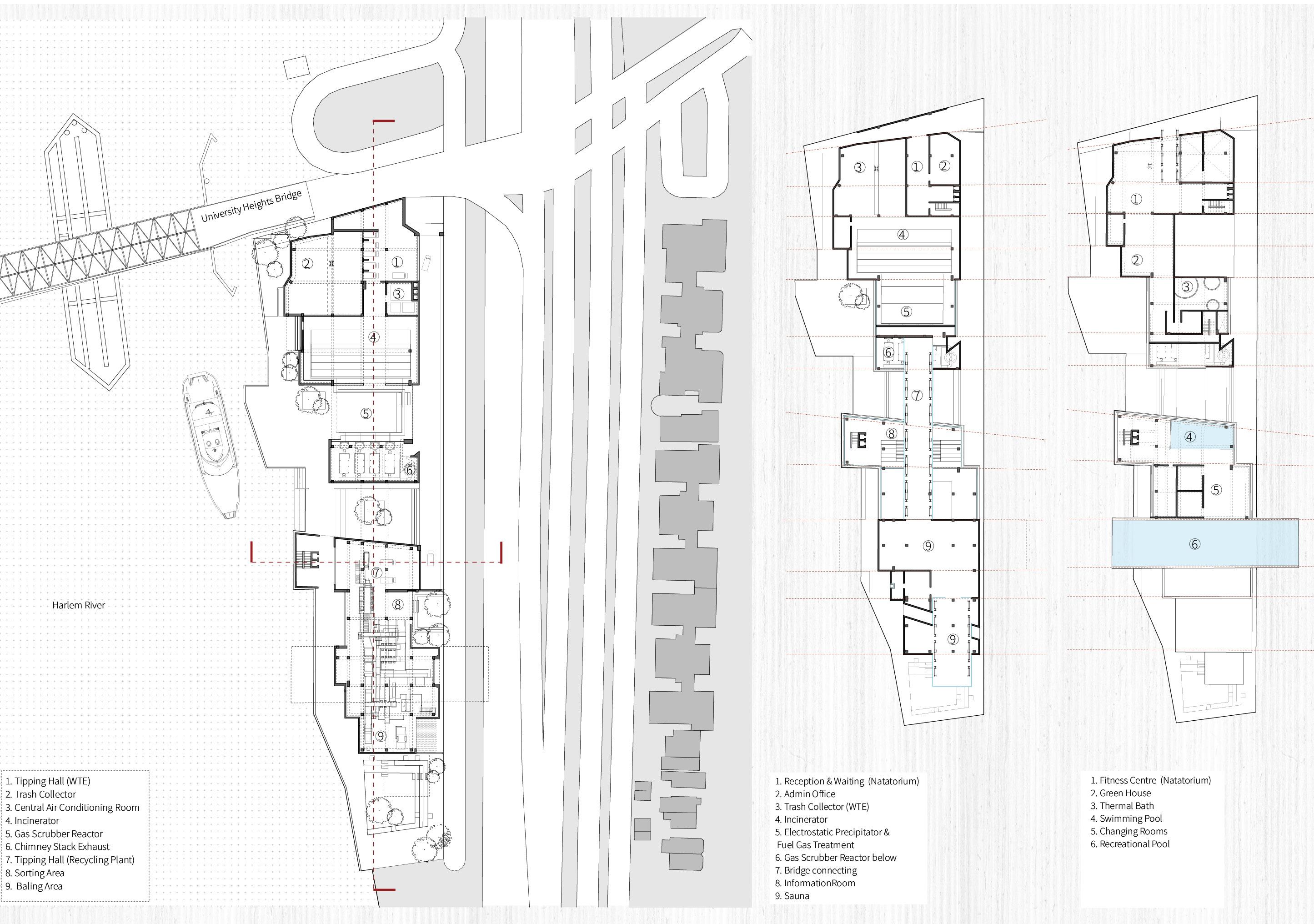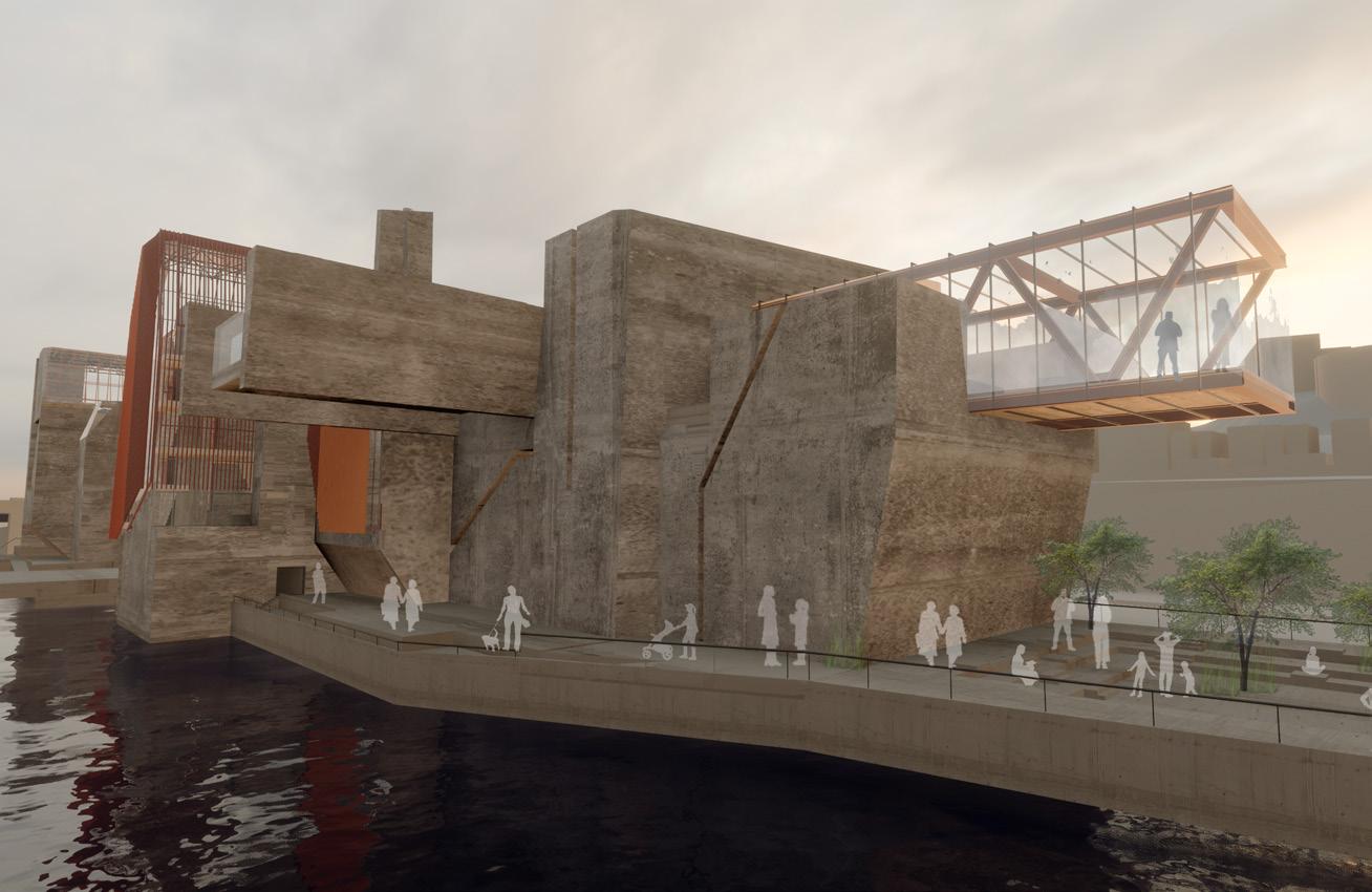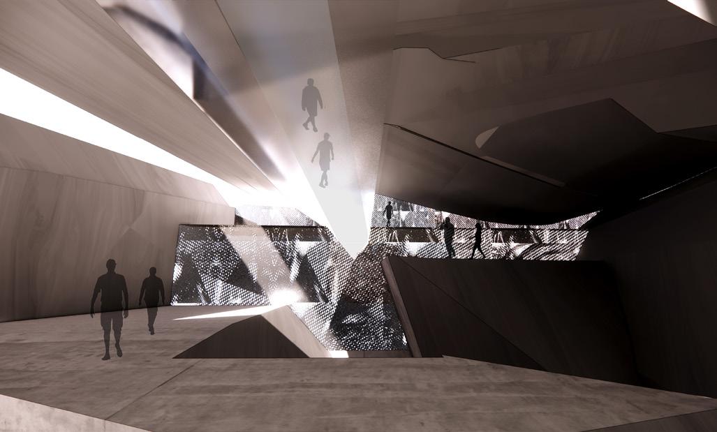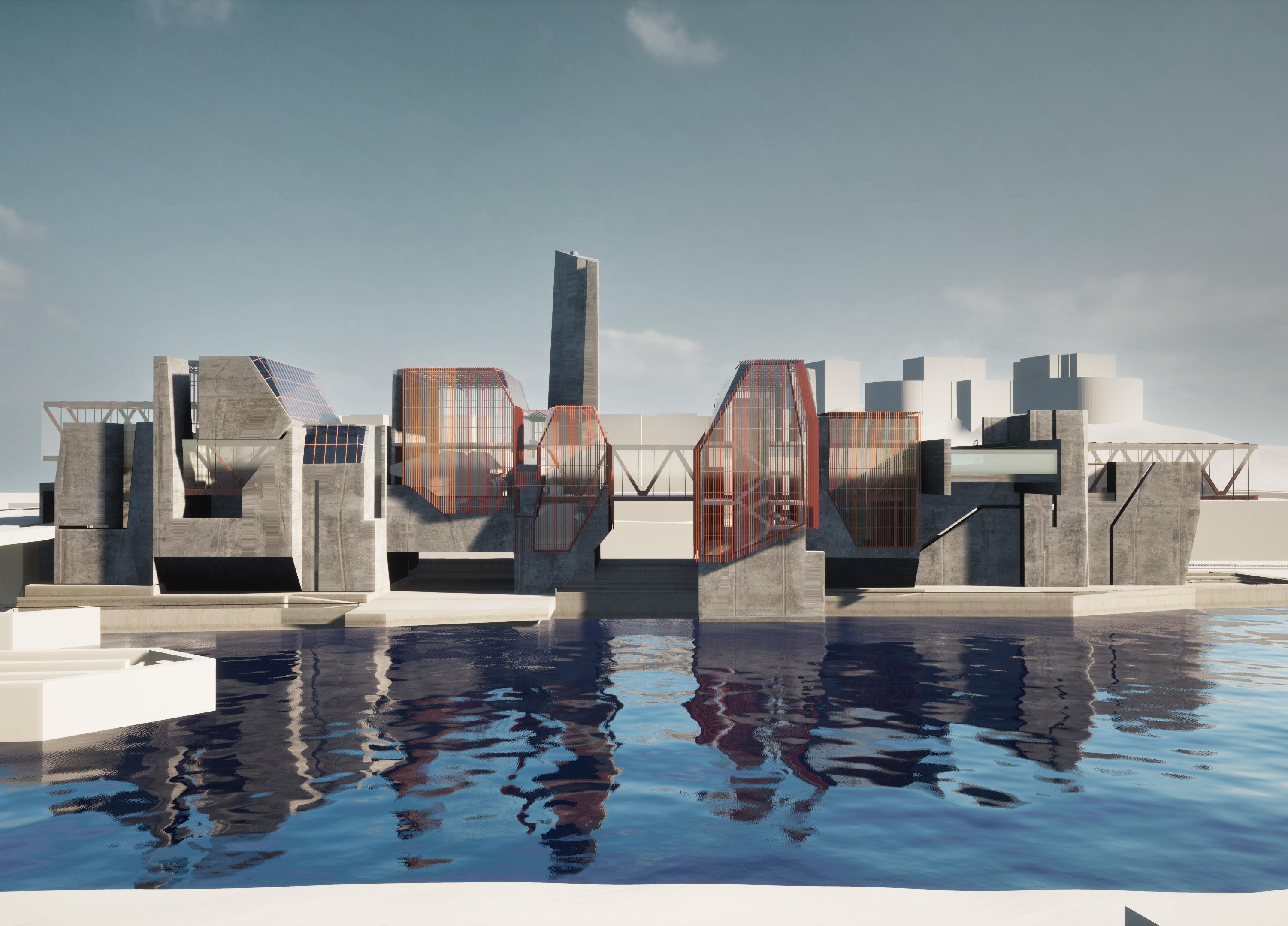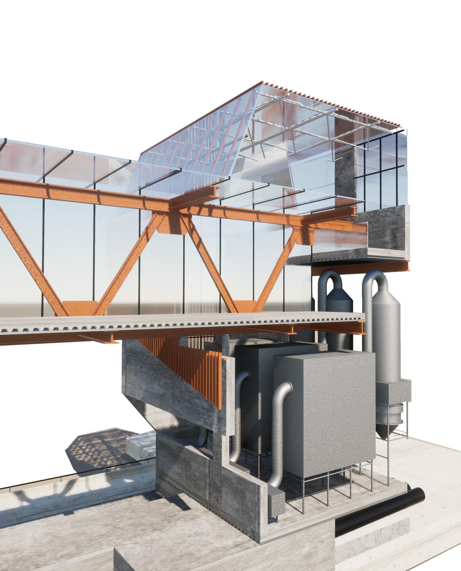 Our main goal is to draw in the local community members to learn about the effects of trash disposal. To build a connection between the waste and the other programs. Hence, a studio project with a brief to design waste to energy recycling plant with natatorium speculates the opportunities to blur the boundaries between various stages of industrial process of the factory. The formal language of the project involves the Natatorium’s activities spread across, with the goal of providing visitors with an insight into the ongoing industrial processes of WTE and recycling units that are occurring concurrently. The depressions are highly inspired by the contextual residential blocks while the scale of the massing is industrial, keeping in mind the functionality of the machinery. Interior follows the similar architectural language to carve the spaces that allows the users to experience different scale and volumes. The horizontal connectivity of glass bridges throughout the building that forms the critical point of visual connection of programs and the outside.