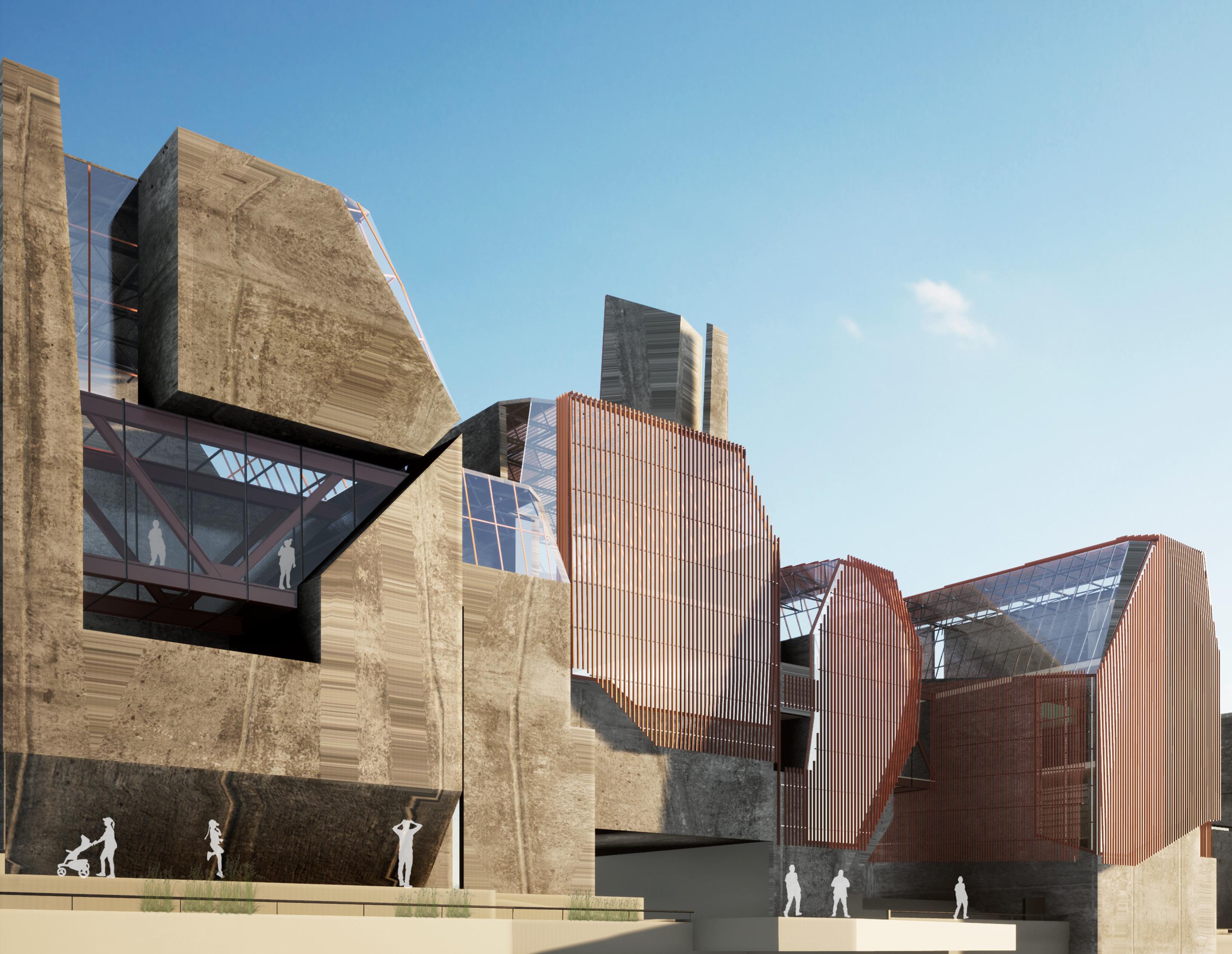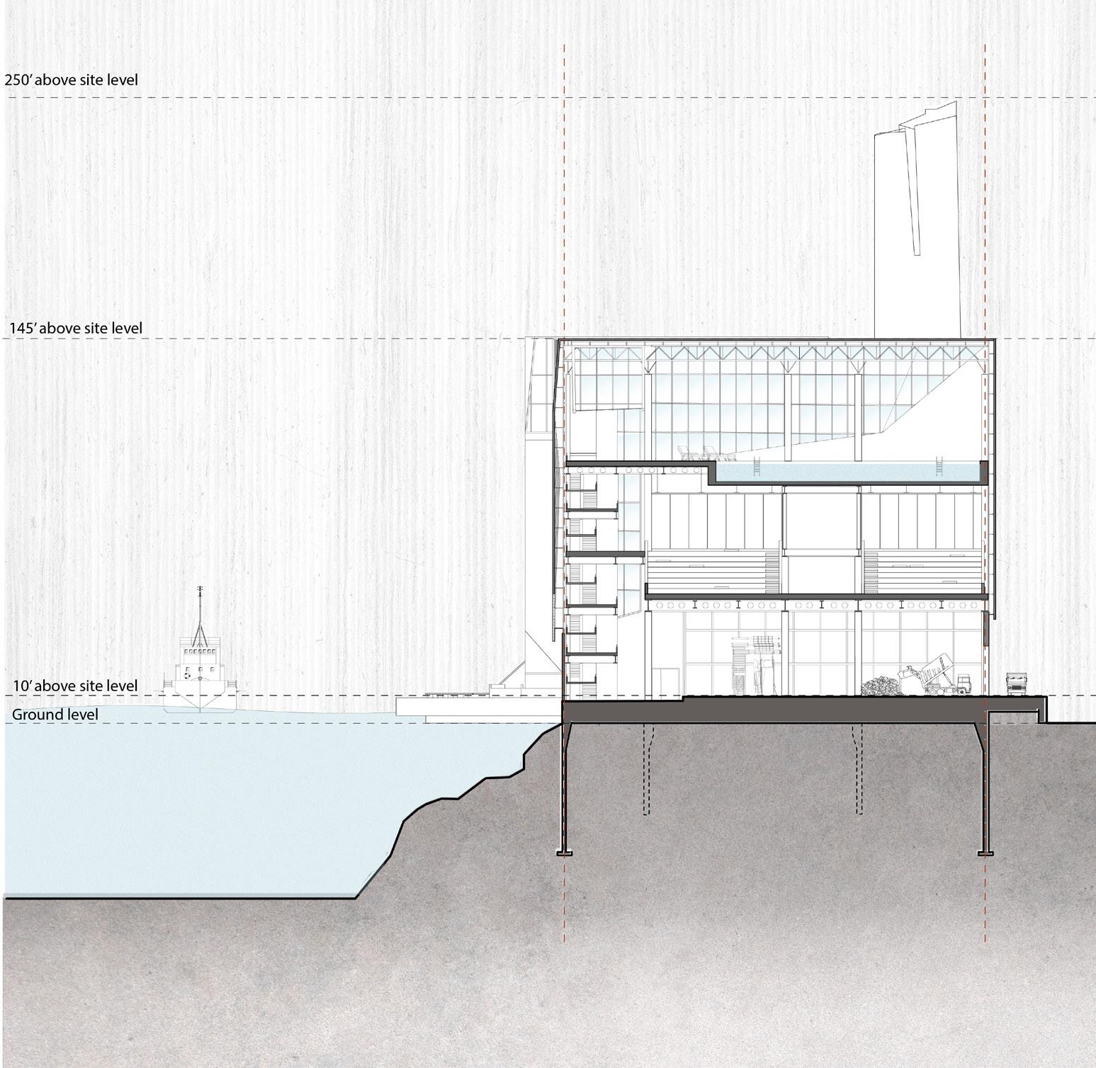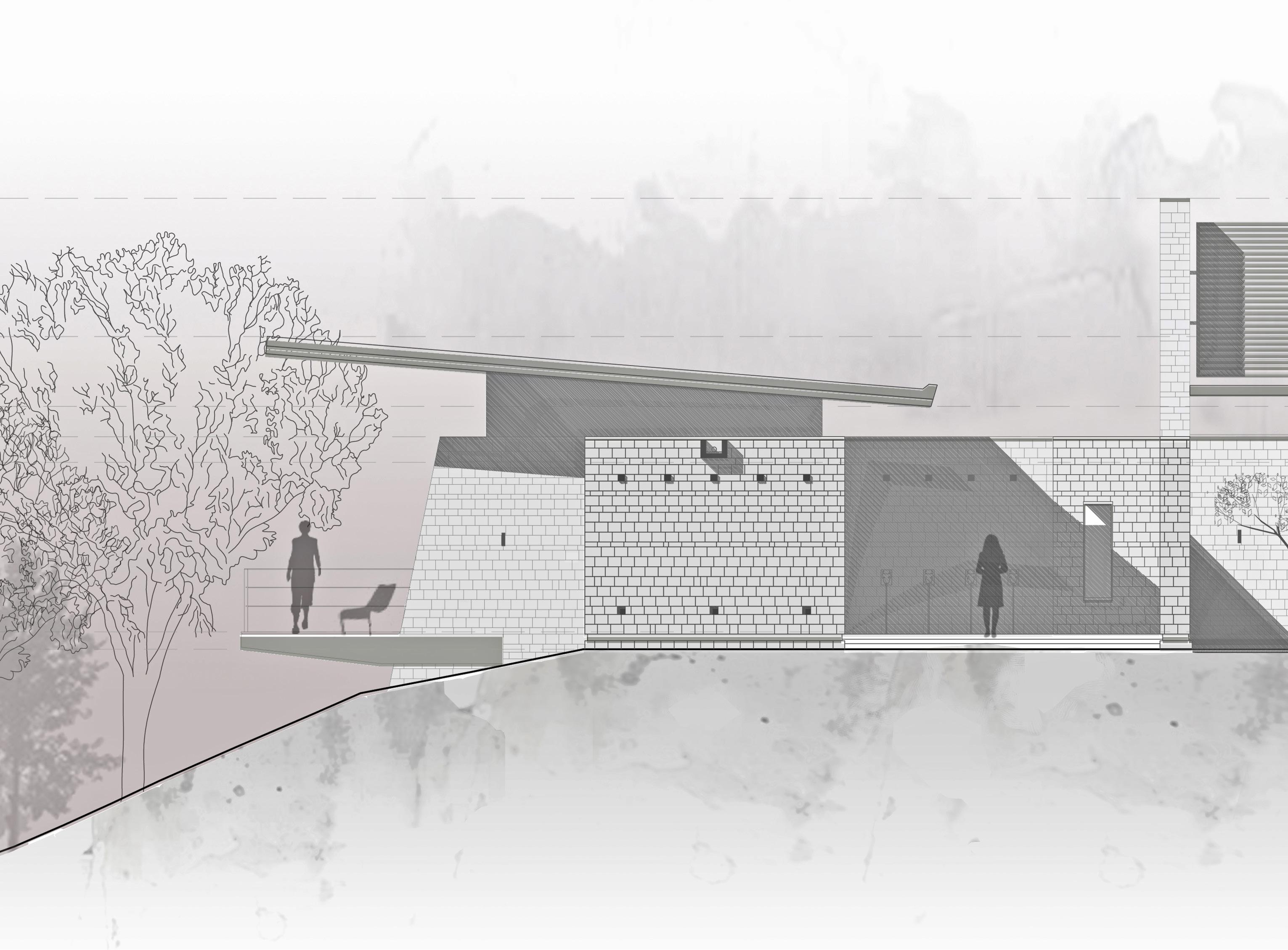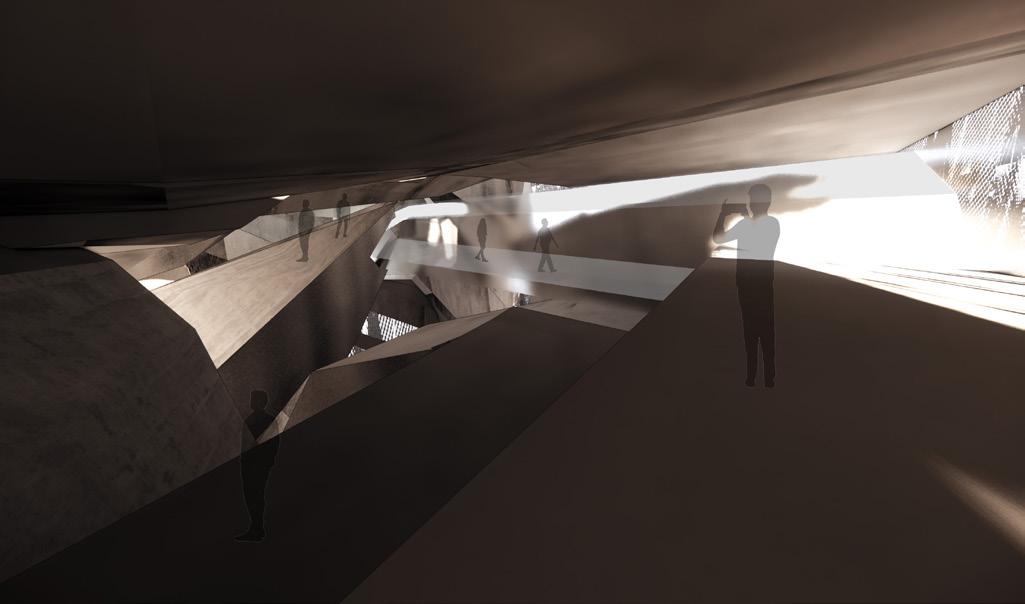 Our main goal is to draw in the local community members to learn about the effects of trash disposal. To build a connection between the waste and the other programs. Hence, a studio project with a brief to design waste to energy recycling plant with natatorium speculates the opportunities to blur the boundaries between various stages of industrial process of the factory. The formal language of the project involves the Natatorium’s activities spread across, with the goal of providing visitors with an insight into the ongoing industrial processes of WTE and recycling units that are occurring concurrently. The depressions are highly inspired by the contextual residential blocks while the scale of the massing is industrial, keeping in mind the functionality of the machinery. Interior follows the similar architectural language to carve the spaces that allows the users to experience different scale and volumes. The horizontal connectivity of glass bridges throughout the building that forms the critical point of visual connection of programs and the outside.