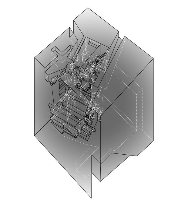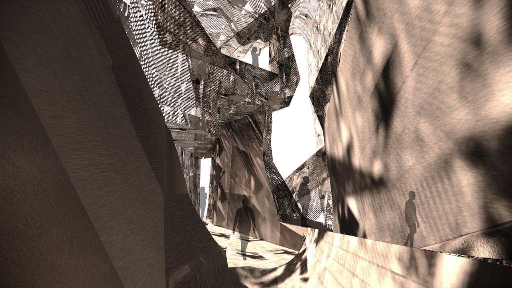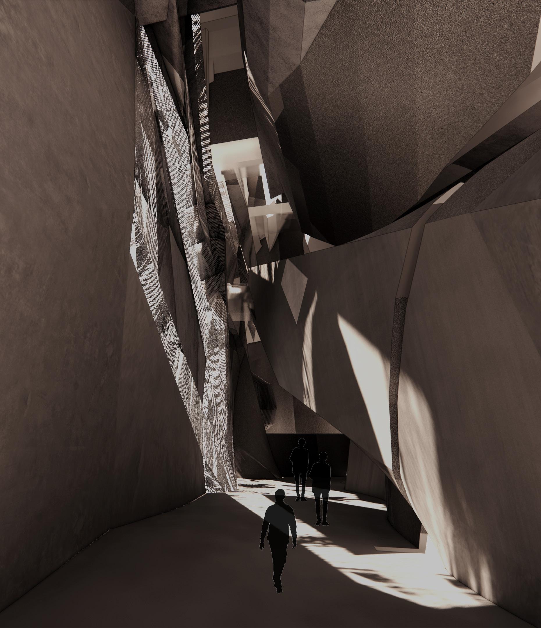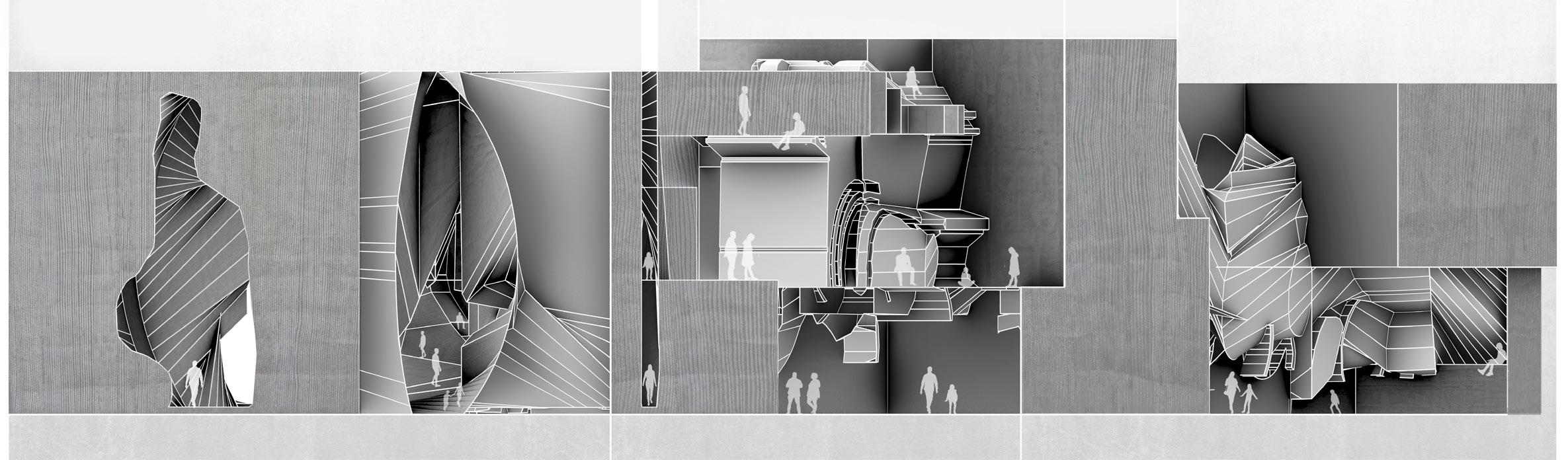 2.It is but the ideas of forms and spaces.The complexities are visible from the outside. The intersection of planes shows the chaoticness with intertwingling thoughts. The structure looks like a free collage of variegated surfaces and materials. The spaces embrace individuality and celebrated the lonesome. It creates many individual spaces in one large space. It gives us a sense of belonging, where the user perceives the space as an extension of themselves. It emphasizes a provocative assemblage of assorted elements, and spaces, in the case of this project attains a monumental quality.