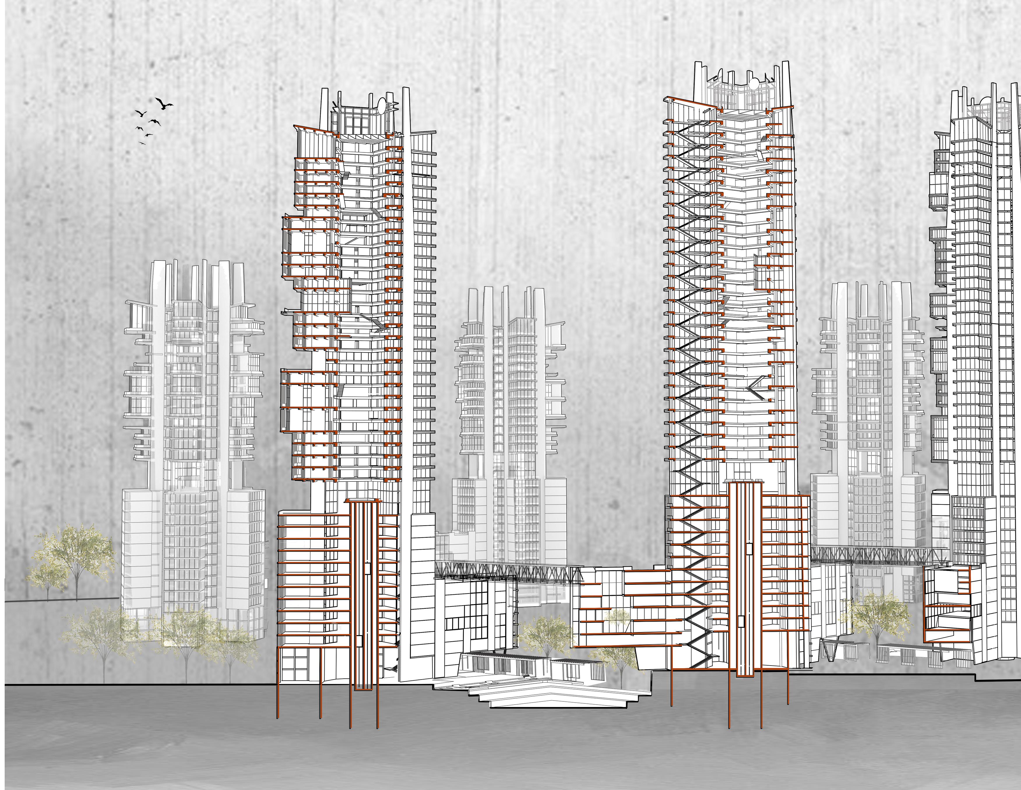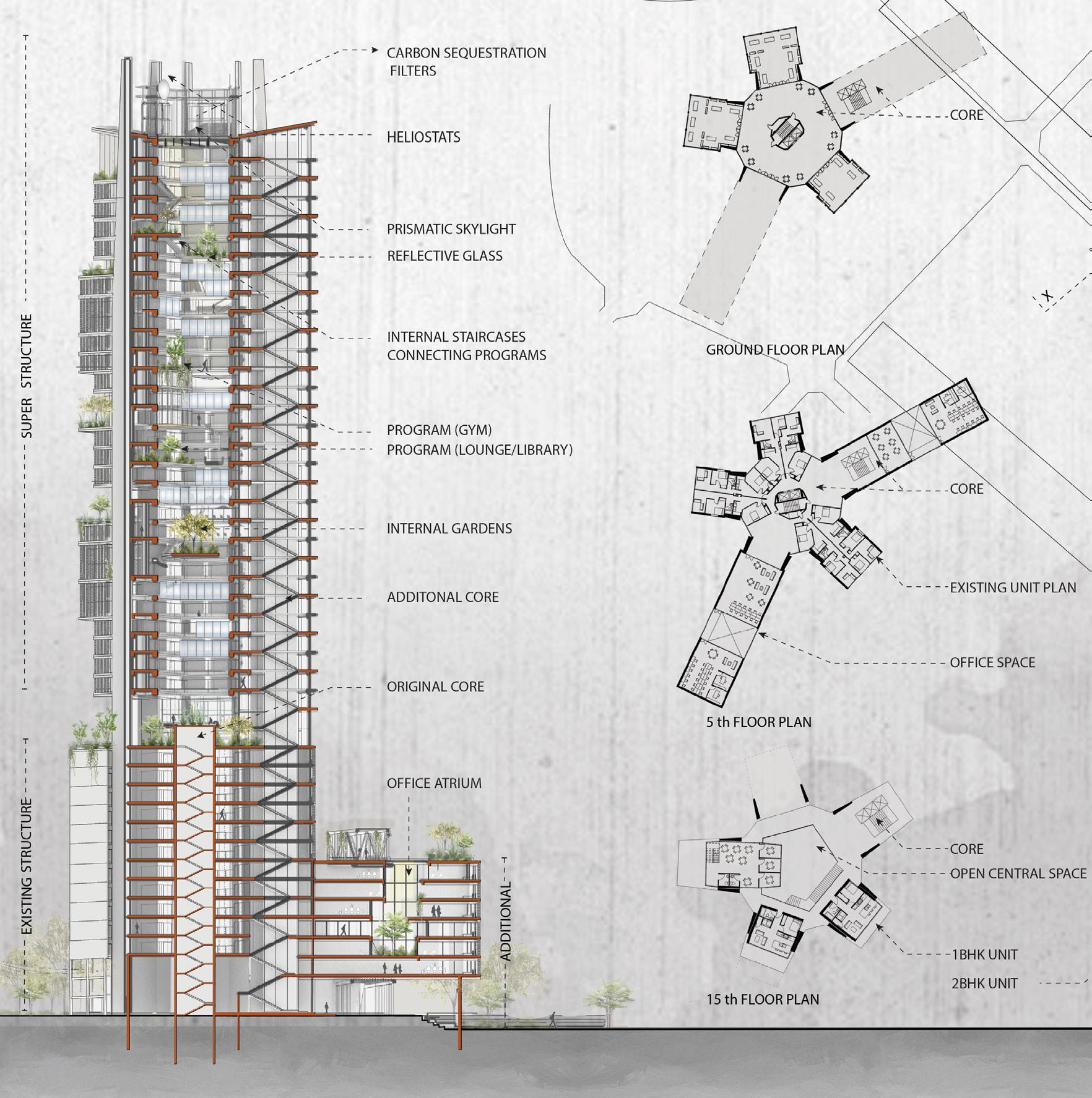 A city which generates a livable space by celebrating the site’s existing features but also by adding to it. The program comprises of High-rise residential tower with amenities with various possible Housing types (Micro housing/mix unit sizes/lo/lux, etc)-and various amenities which are lacking at present. The project aid to create jobs, and increase interaction and socialization by producing eyes on the street which will allow the site to be self-sustainable for the future generation. Furthermore, design is environmentally responsive, removal of excess carbon through the Carbon Sequestration Process. Also, optimizing natural light and adding green spaces creating a healthy sustainable environment.