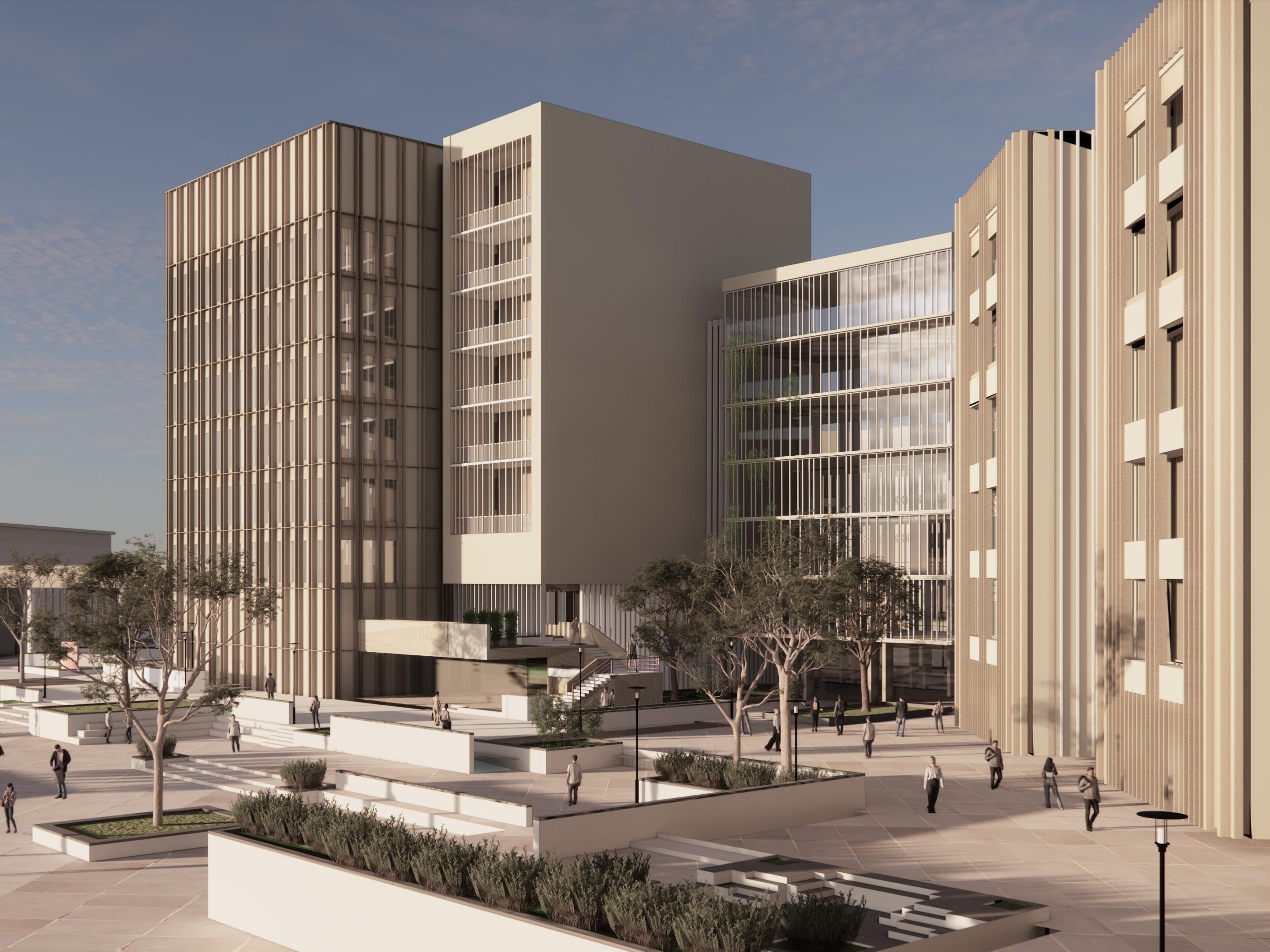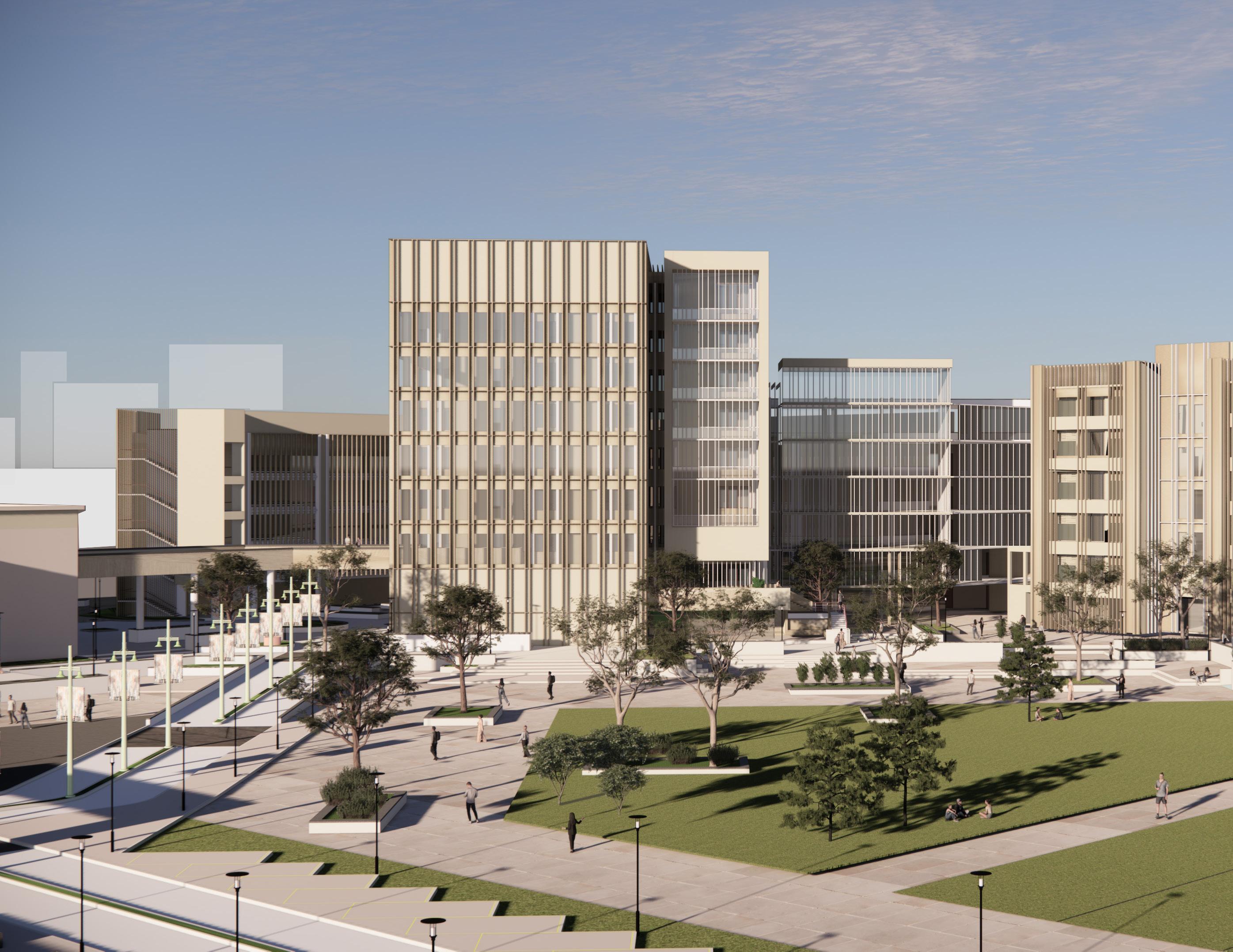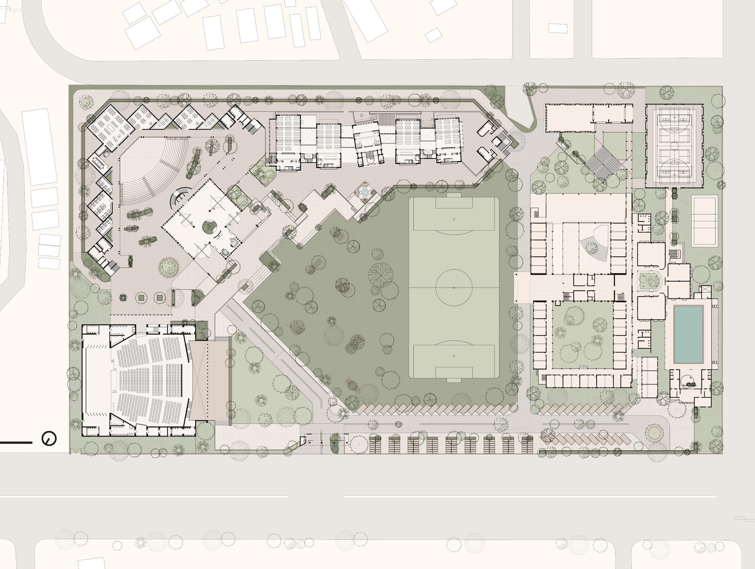 The master plan includes- academic block, faculty block, class rooms, department library, laboratories, boys and girls hostel, convention center, Sports complex, auditorium, cafeteria, and other amenities like swimming pool, open ground, football ground and amphitheater.