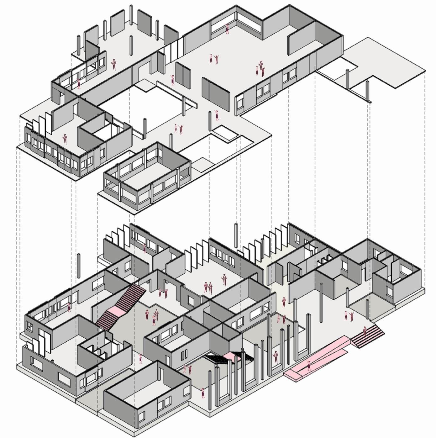The main materials chosen include locally available stone-for the structure of load bearing walls and timber-for the roof and floor.Choosing this combination responds to the harsh climate of the region by exploiting the thermal insulating properties of stone and pitched timber roofs help to easily drain off water as this area experiences quite heavy rainfall.