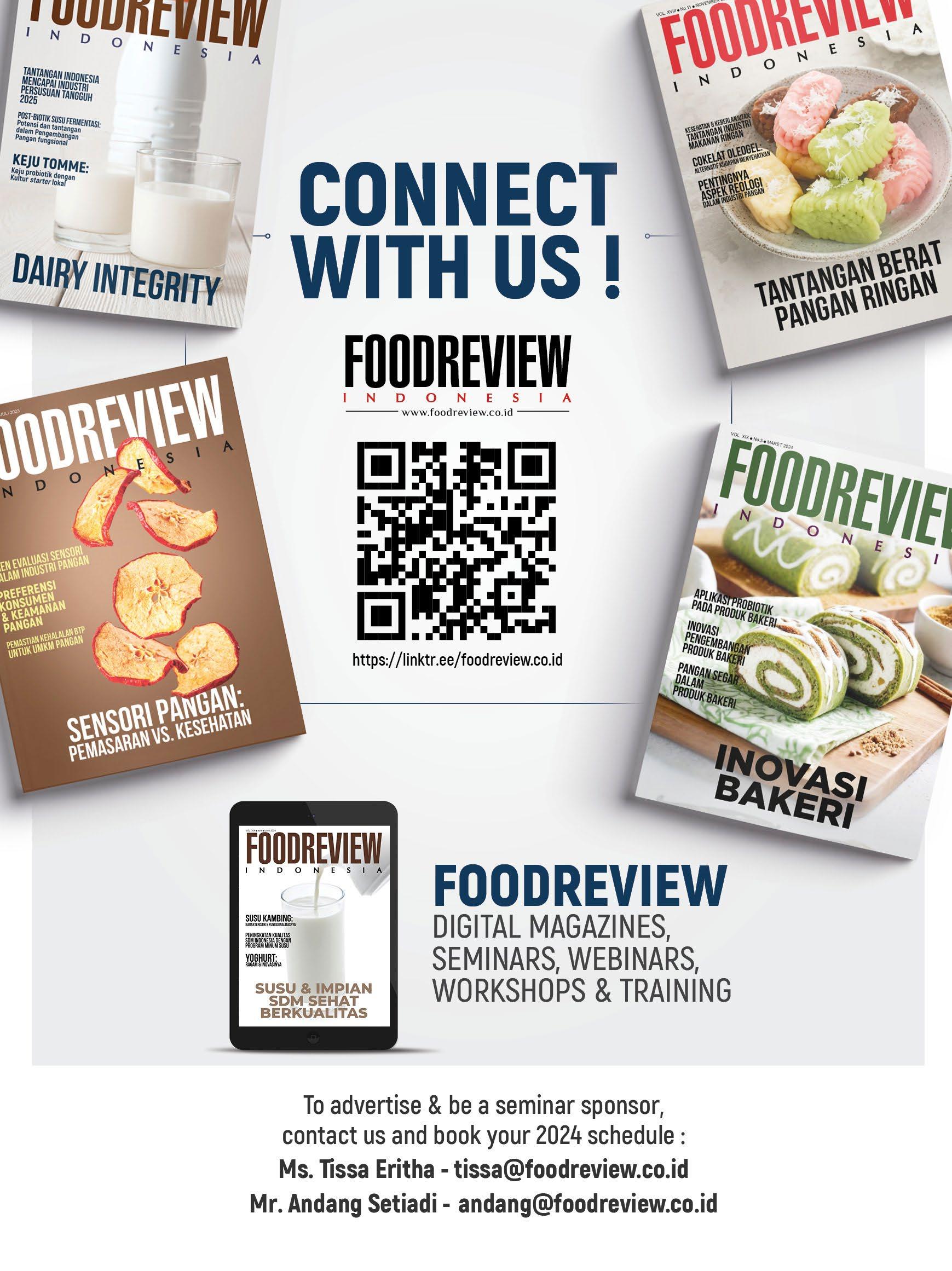 Penerbit: PT Media Pangan Indonesia Alamat PT Media Pangan Indonesia: Jl Binamarga II No. 23, Baranangsiang, Bogor Timur 16143 Telepon: (0251) 8372333, (0251) 8322732 | +62 811 1190 039 | Fax: (0251) 8375754 Website: www.foodreview.co.id | E-mail: redaksi@foodreview.co.id, marketing@foodreview.co.id ISSN: 1907-1280