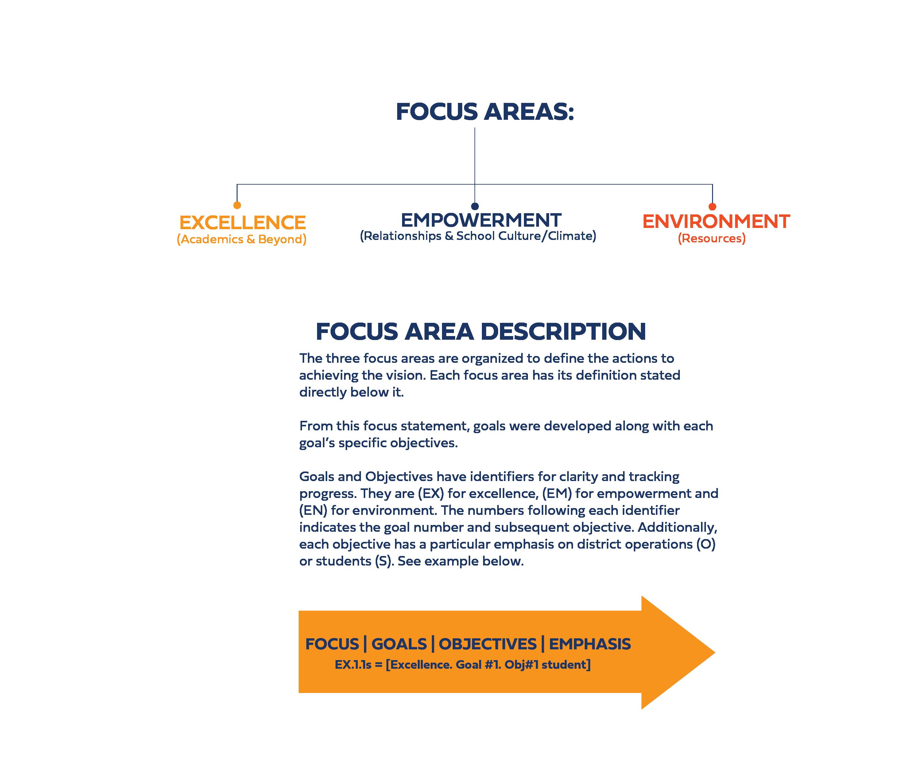 This strategic plan is structured with a core framework comprising of our vision, mission, core values and three focus areas. These three focus areas are empowerment, excellence and the environment. These areas provide focus for the development of the district’s 11 goals as well as the 77 subsequent objectives.