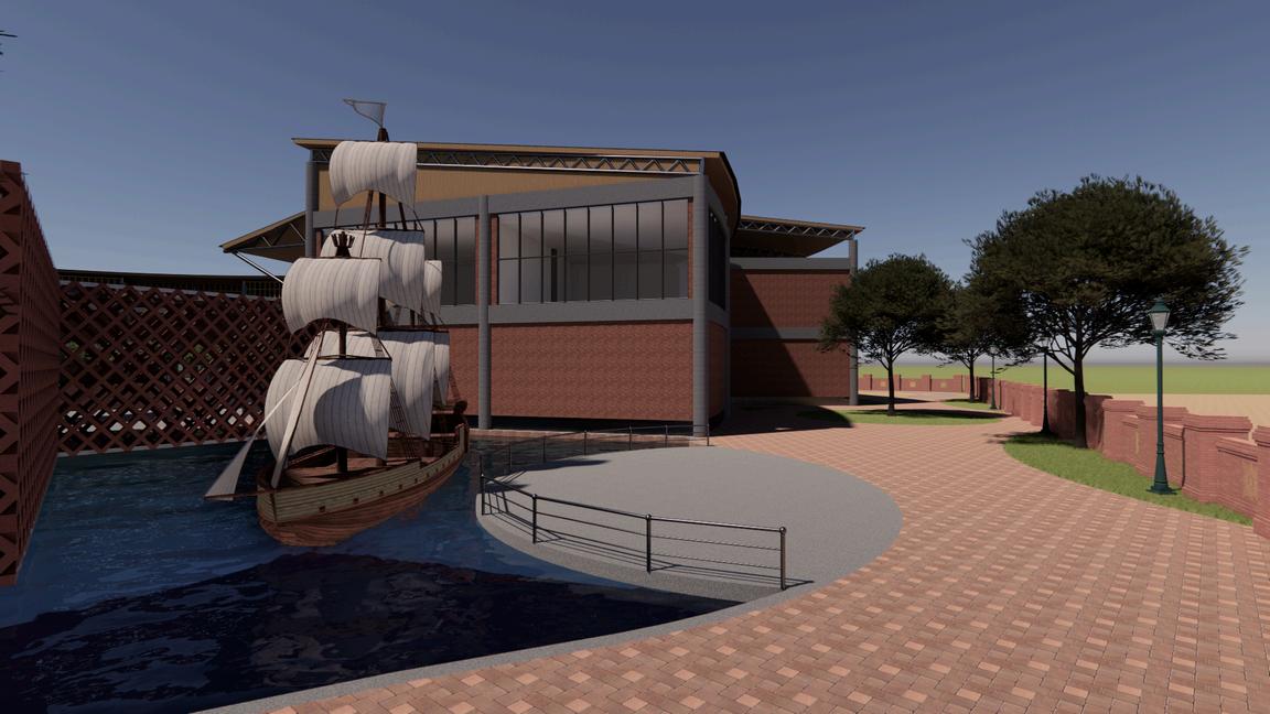 Implementasi pada perancangan yaitu pada penataan area plaza dan taman menggunakan tema budaya Kerajaan Majaphit seperti penggunaan lambang Surya Majapahit dan replika dari kapal zaman Majapahit