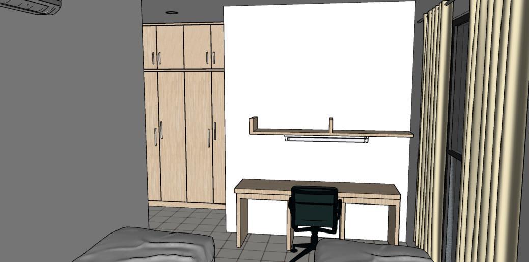 The fourth option is to remove the ceiling fan. As previously stated, I rarely use the ceiling fan, therefore it's best to remove it. Furthermore, instead of a fan, an LED light will be installed in that location (the second solution). The last solution is to move the air conditioner to the opposite wall (as shown in figure 3.6 and figure 3.7). The wind will fill the entire space at that position.