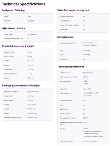 • Housing: Synthetic • Housing Paint: White • Cut Out Size (mm): 150D • Dimension (mm): 165D x 47H • Wattage: 10W • Lumen Output: 900lm • Voltage: 220-240V
