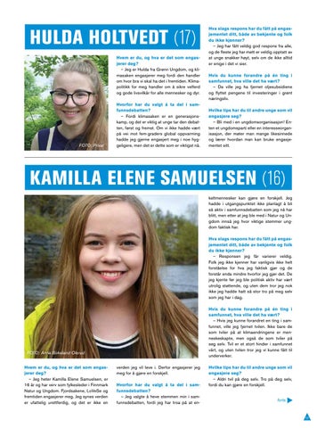 KAMILLA ELENE SAMUELSEN (16) keltmennesker kan gjøre en forskjell. Jeg hadde i utgangspunktet ikke planlagt å bli så aktiv i samfunnsdebatten som jeg nå har blitt, men etter at jeg ble med i Natur og Ungdom innså jeg hvor viktige stemmer ungdom faktisk har. Hva slags respons har du fått på engasjementet ditt, både av bekjente og folk du ikke kjenner? – Responsen jeg får varierer veldig. Folk jeg ikke kjenner har vanligvis ikke helt forståelse for hva jeg faktisk gjør og de forstår enda mindre hvorfor jeg gjør det. De jeg kjente før jeg ble politisk aktiv har vært utrolig støttende, og uten dem tror jeg nok ikke jeg hadde hatt så stor tro på meg selv som jeg har i dag. Hvis du kunne forandre på én ting i samfunnet, hva ville det ha vært? – Hvis jeg kunne forandret en ting i samfunnet, ville jeg fjernet tvilen. Ikke bare de som tviler på at klimaendringene er menneskeskapte, men også de som tviler på seg selv. Tvil er et stort hinder i samfunnet vårt, og uten tvilen tror jeg vi kunne fått til underverker.