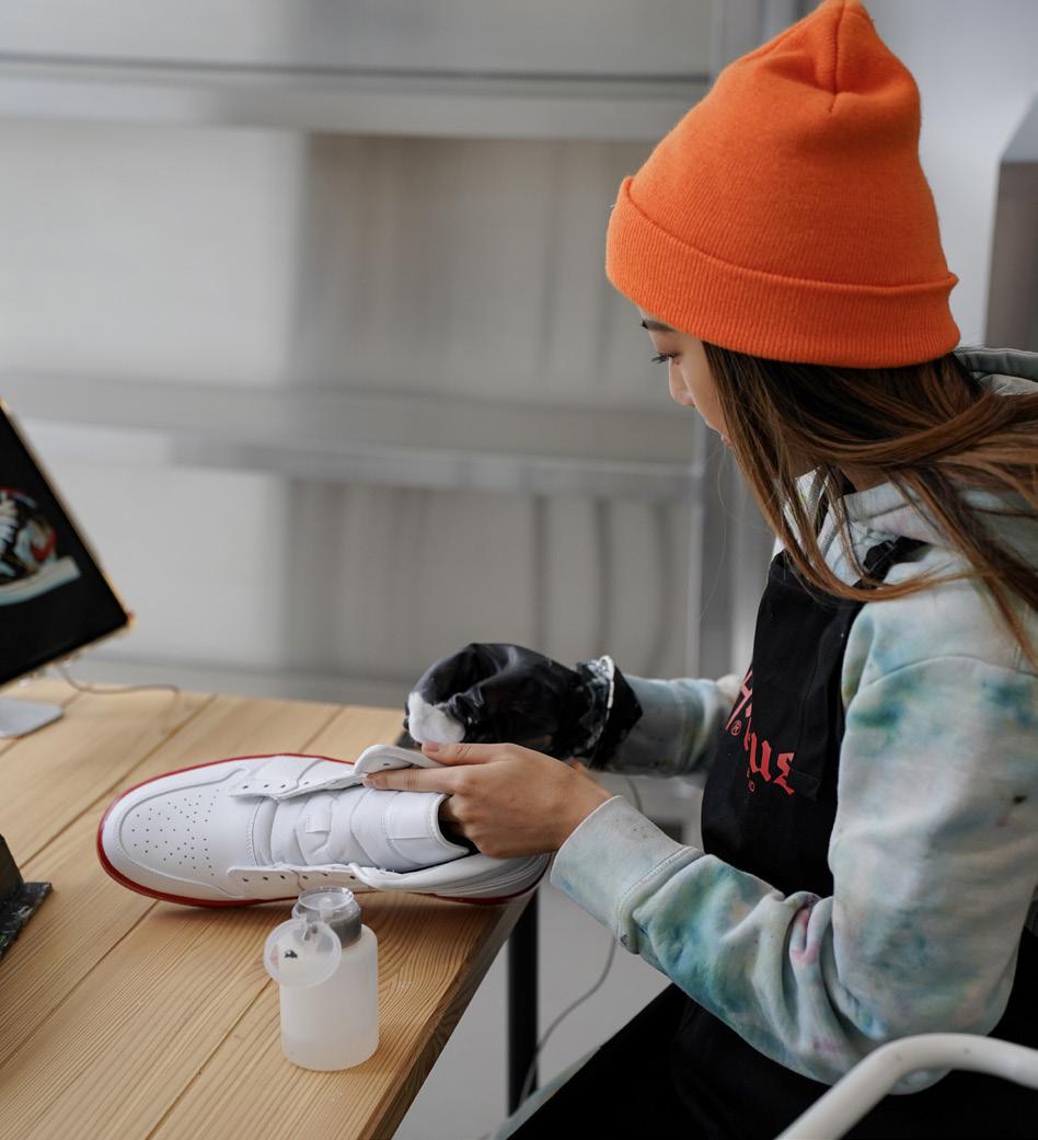 Kira in her studio as she customizes a pair of Air Jordan 1’s.