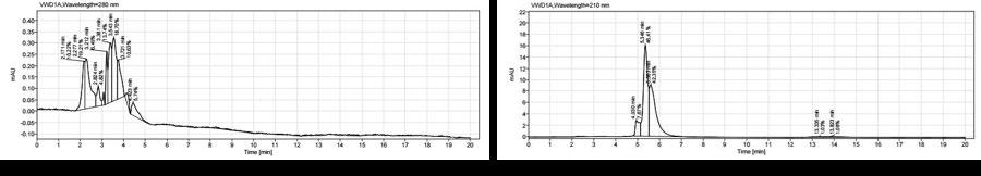 HPLC results for the pesticide standard and a representative sample run is given below. According to preliminary data from the strawberry sample and the standard, there may be peaks associated with pesticides. The HPLC profiles of the sample and the standard did not match exactly. Detail analysis using mass spectrometry coupled to the HPLC system will lead to a clear confirmation of the pesticides. For better statistical significance, more samples need to tested.