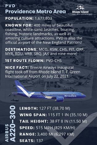 According to the U.S. Department of Transportation, Rhode Island T. F. Green International Airport (PVD) has become the nation’s fastest-growing airport among the top 75 airports, based on seat capacity. PVD also has the distinction of having the largest yearover-year passenger growth. This impressive increase in passenger traffic has been driven by Breeze Airways, JetBlue Airways, and Southwest Airlines all adding new nonstop service across the country from PVD. The airport’s expanding