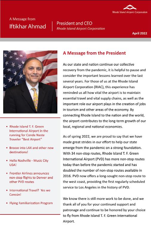 Finally, we are most thankful for the strong and consistent support demonstrated by the people of our state, who honor us each time they choose to “Fly RI.” As we enter a critical juncture of both local and national recovery, your commitment makes all the difference: as we attract new airlines and routes, create new economic opportunity, and move Rhode Island forward to a brighter future.