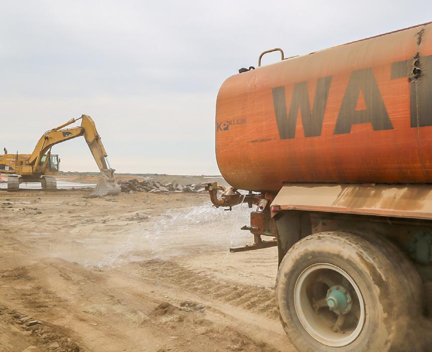 Runway construction protocols include efforts to minimize blowing dust through liberal water application on exposed soil.