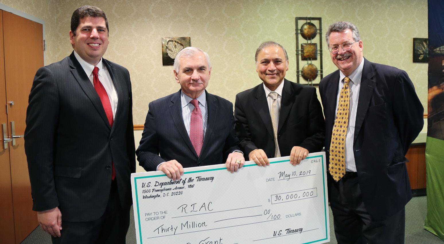 Senator Jack Reed presents an Airport Improvement Grant check for runway and taxiway upgrades at Rhode Island T. F. Green International Airport.