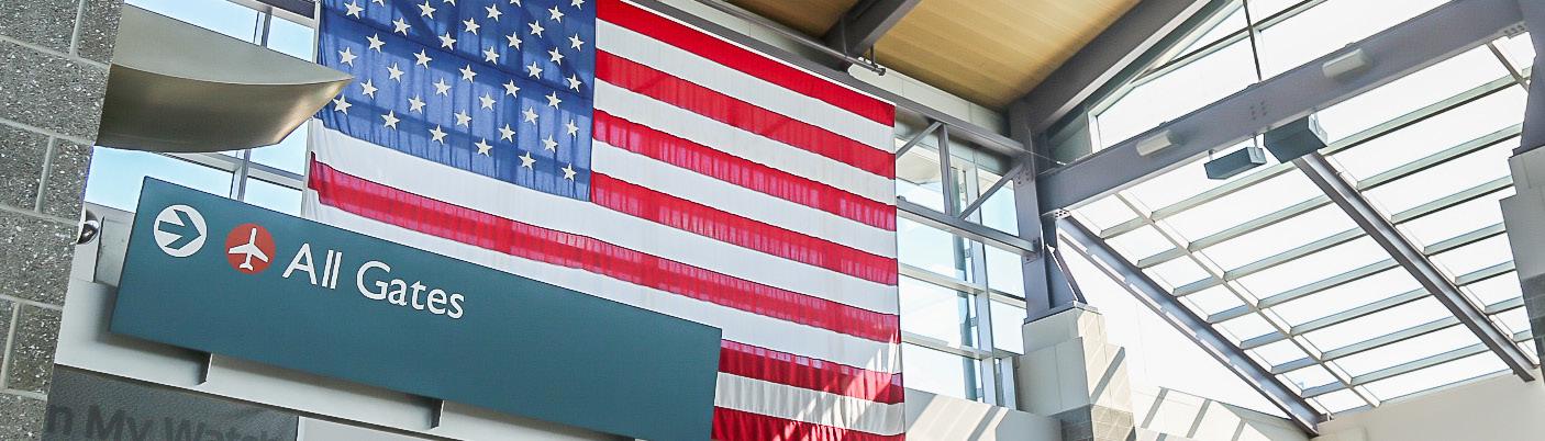 Rhode Island T. F. Green International Airport’s iconic American flag greets travelers making their way though the security check point.