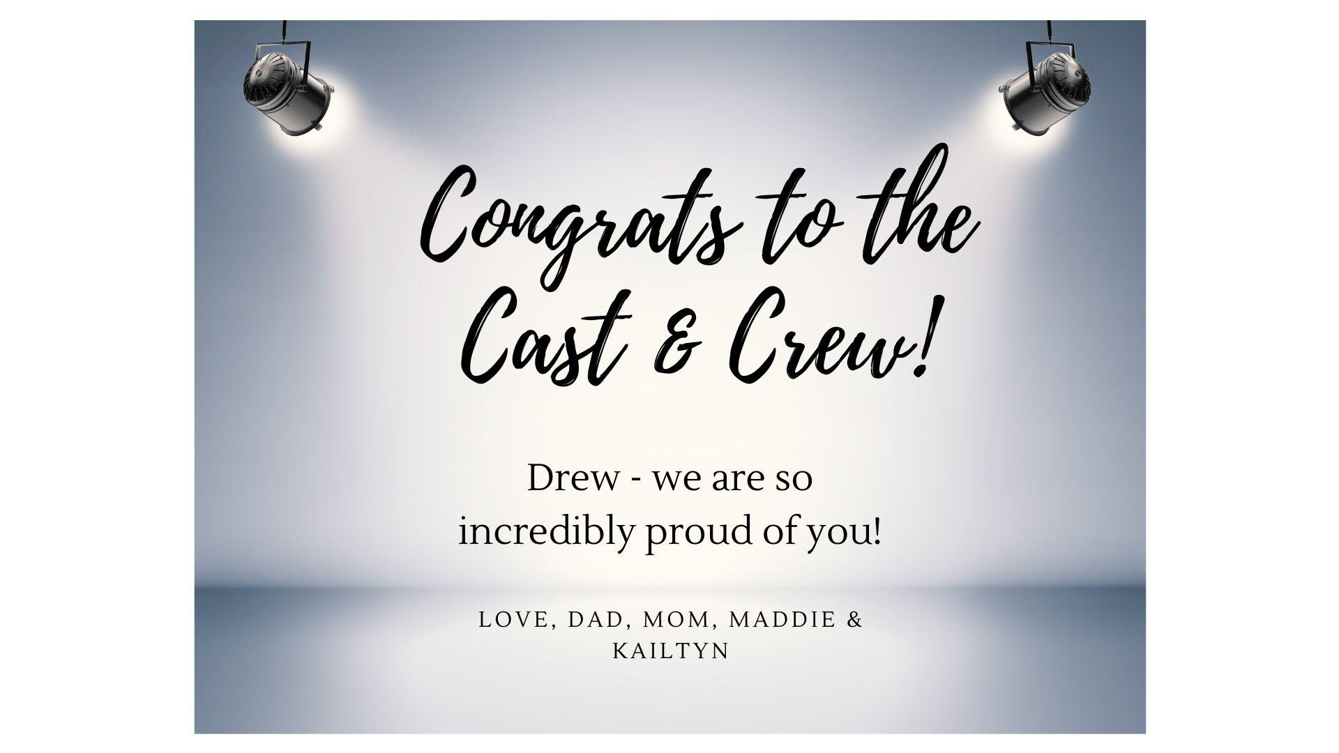We are so proud of how hard you have worked in your first PVI Players' production. Love, Mom, Dad, Melanie, Valerie, Frankie, Grandpa and Grandma, Annie and Grandpa Joe.