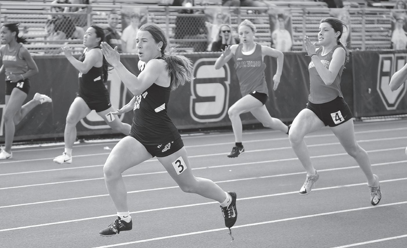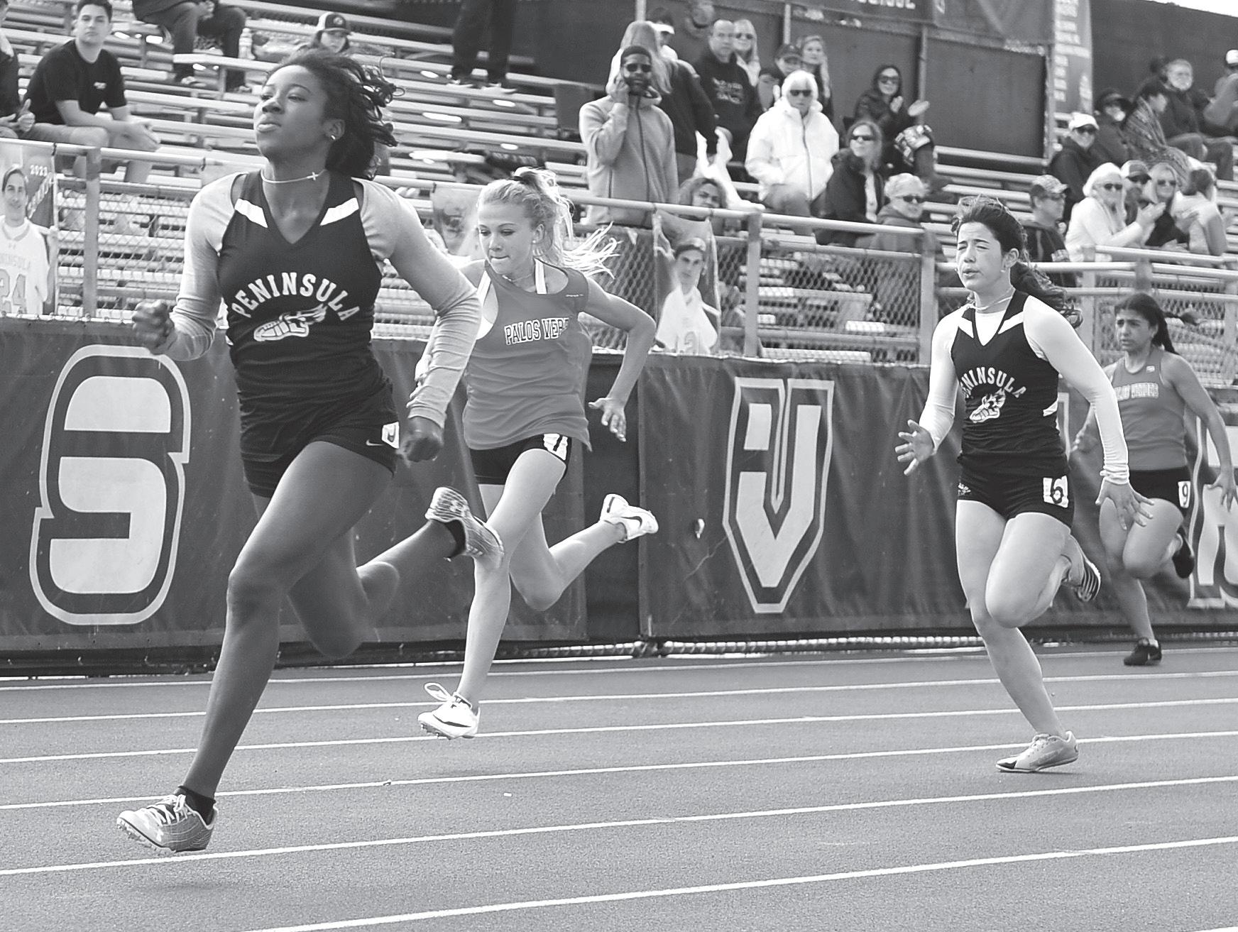 Fast Cat . . . Peninsula High sophomore sprinter Camria Cardenas runs a smooth 13.46 to take first place in the girls’ varsity 100 meter sprint.