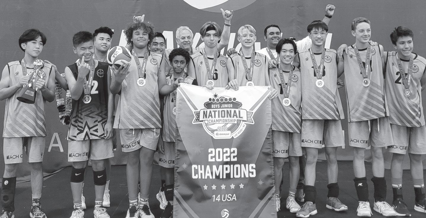 Beach Cities Volleyball 14 Black Wins National Championship Gold Medal . . . A team of 10 South Bay 14-year-olds from Beach Cities Volleyball’s 14 Black team won a national volleyball championship gold medal at the 2022 USA Volleyball Boys Junior National Championship (BJNC) in Las Vegas, Nevada this summer. After qualifying at the SCVA National BID Tournament this past January, the team won 11 games against teams from across the United States, Puerto Rico, and ultimately the championship finals against the HVA Young Guns from Houston, Texas. Losing the first game 25 - 15, the BCV 14 Black came back to win the second game 25 - 23. They proceeded to defeat the Guns with a 15 - 12 winning score in the tie-breaking third round. Beach Cities Volleyball, in its 23rd year, was founded by Chip Schulte, who serves as Club Director and Head Coach. Beach Cities Volleyball is in the midst of its summer camp and high performance clinics, with upcoming high school girls tryouts. During the school year, BCVC offers club volleyball, clinics, tournaments, and a Future Stars program for entry level players.