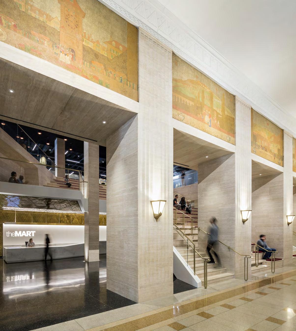 Rather than creating a simple port of entrance and exit, theMART’s new lobby allows for a new kind of engagement by slowing down the pace of passage. Historically, building lobbies have been a calling card for the building’s owners. They are meant to impress. Functionally, lobbies have served as mundane points of entrance or exit, often without comfort or reason to linger. Frequently, they are cold buffers between the public and private worlds. The new design transforms the building’s entry into a place with a strong character and identity for new generations of Chicagoans who might not be as familiar with the building’s past.