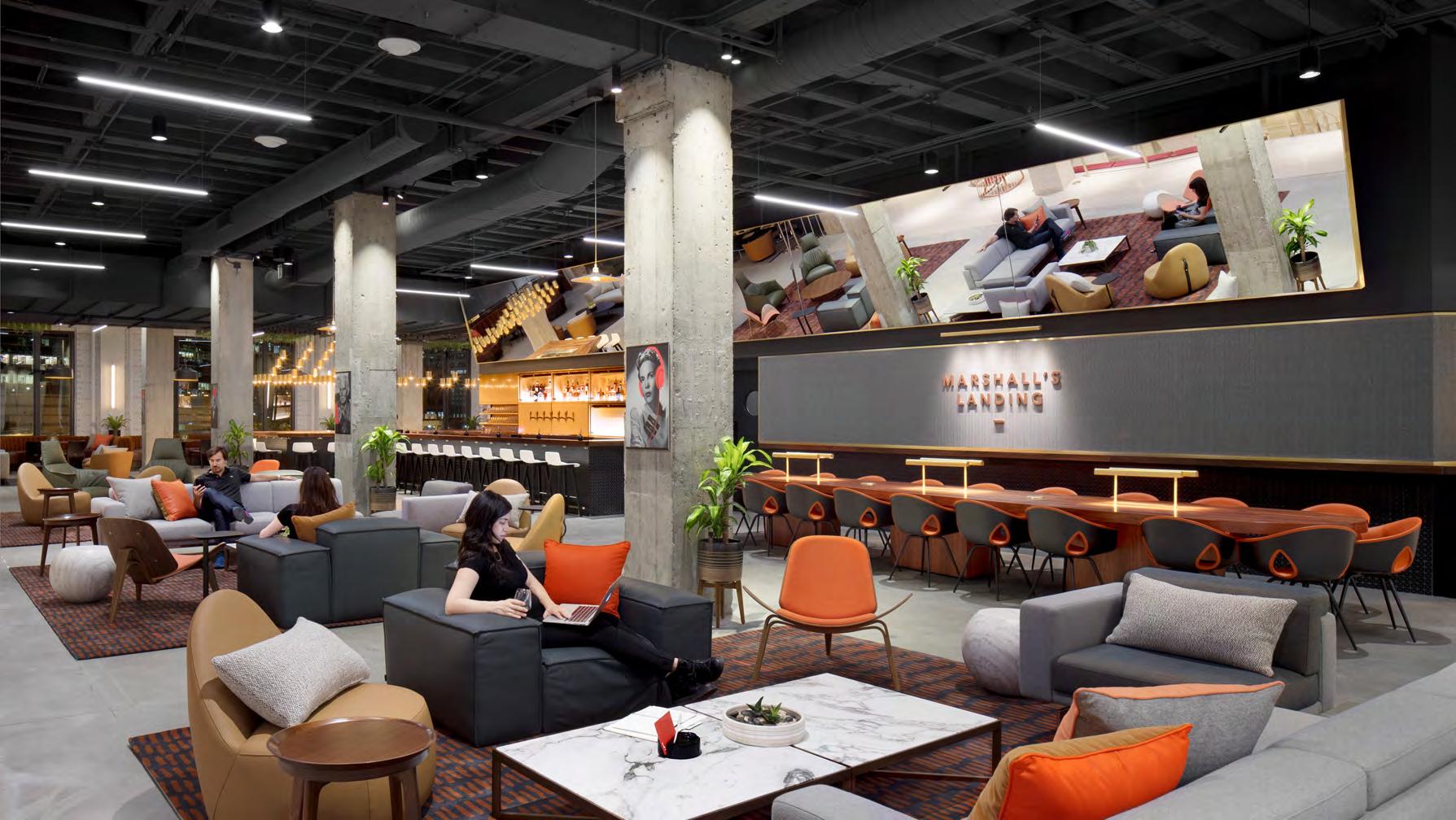 Inside, Marshall’s Landing is a catered lounge located at the top of the new Grand Stair. For over a year, the designers conducted research to determine the best use of this expansive space. The process included the creation of a forum for tenant engagement, canvassing user groups, designing and conceiving of a temporary game lounge in the space that solicited feedback, and forming focus groups to review those results. This holistic engagement process revealed the necessity for a completely new amenity type: an extension of the workplace that promotes varying levels of interaction, with optional food and beverage component offered through an unobtrusive service model.